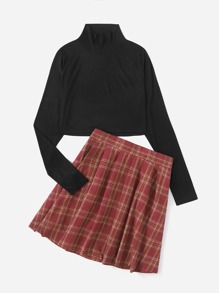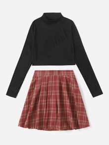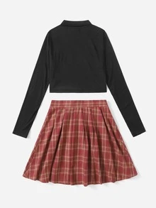 T-shirt côtelé unicolore & Jupe plissée à carreaux