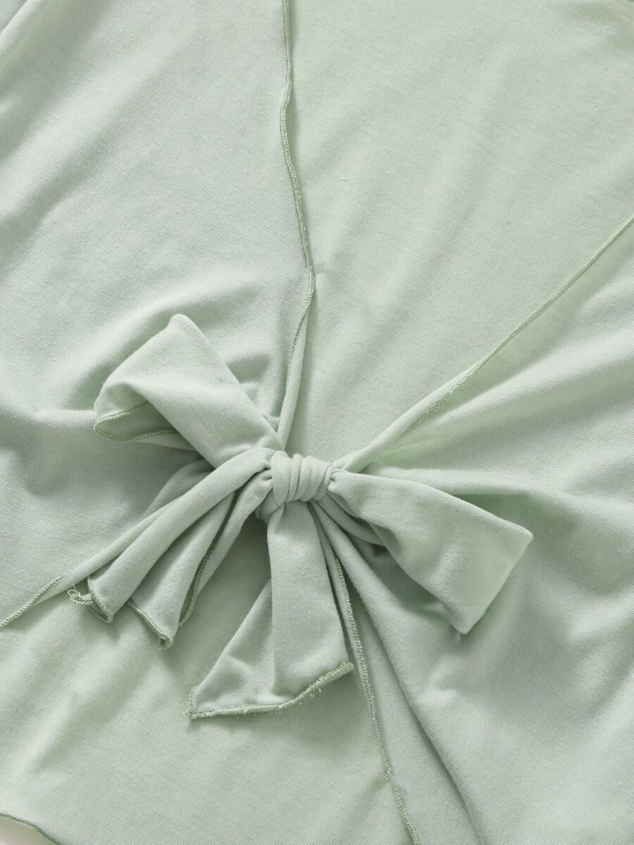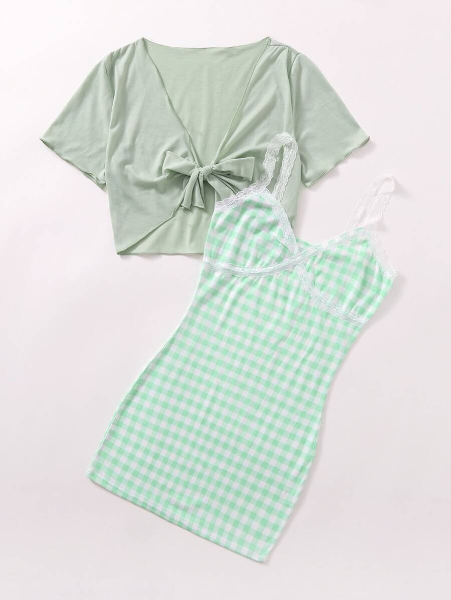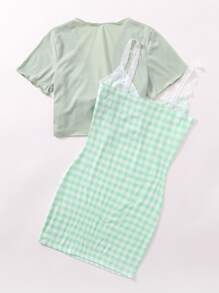 Top unicolore à nœud & Robe à carreaux avec dentelle