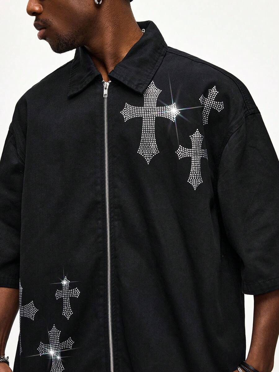 Veste en jean pour hommes avec col rabattu, fermeture éclair avant, décoration de strass, mode polyvalente