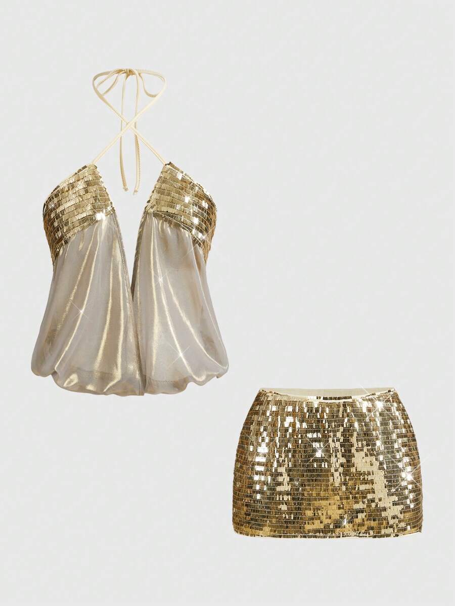 Tenue de festival de musique Y2K, ensemble 2 pièces avec Top court à fines bretelles col V profond en patchwork de sequins et mini-jupe en sequins