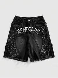 Street Life Short en jean décontracté ample avec décoration de lettre et strass pour hommes