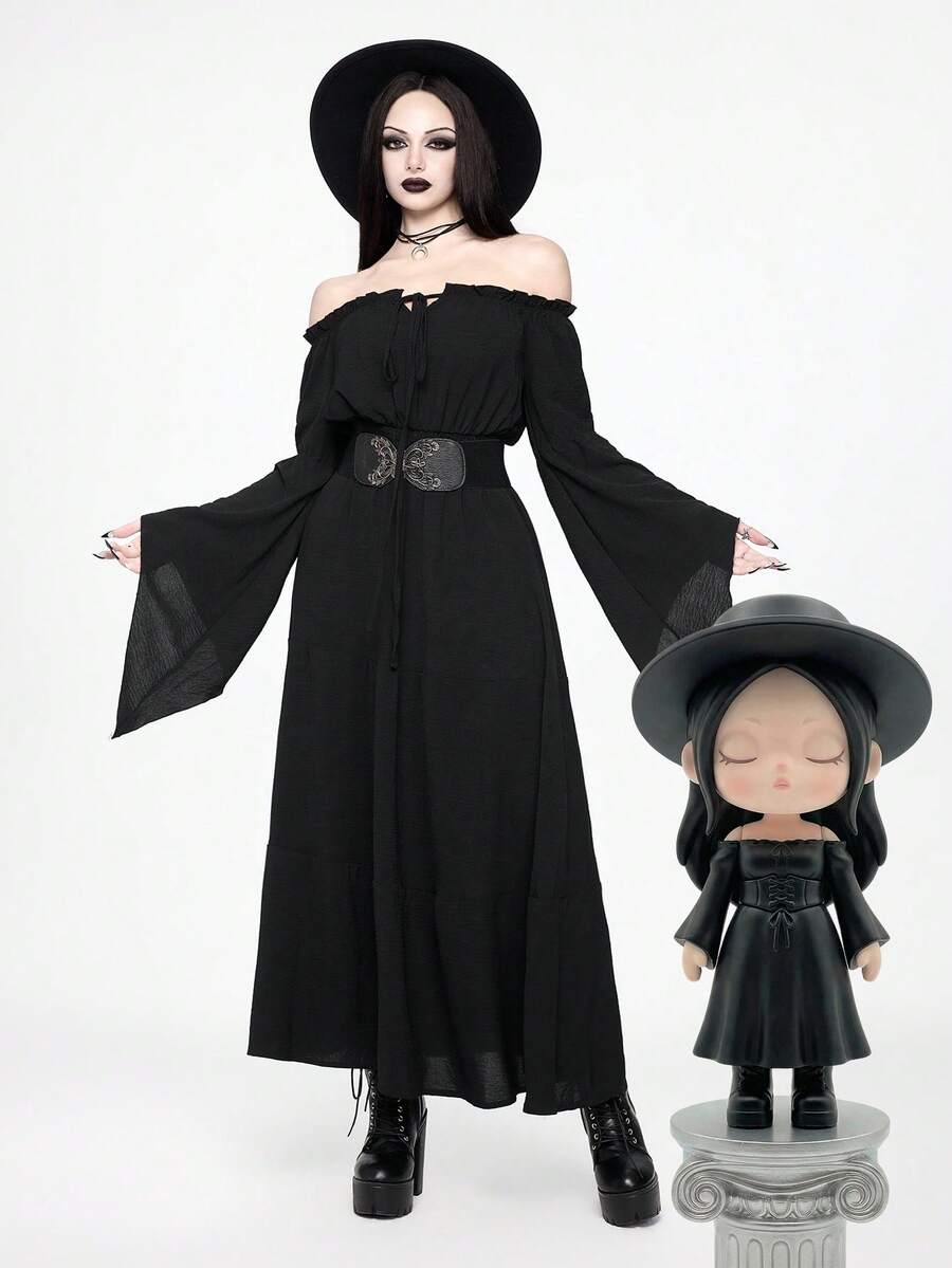 Robe gothique pour femmes avec épaules dénudées, manches évasées et taille cintrée