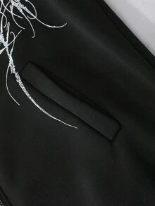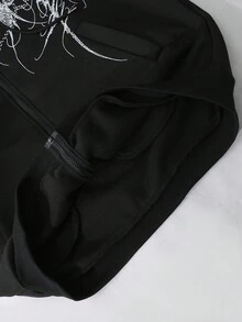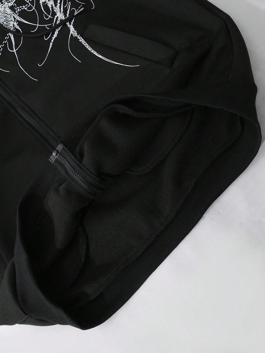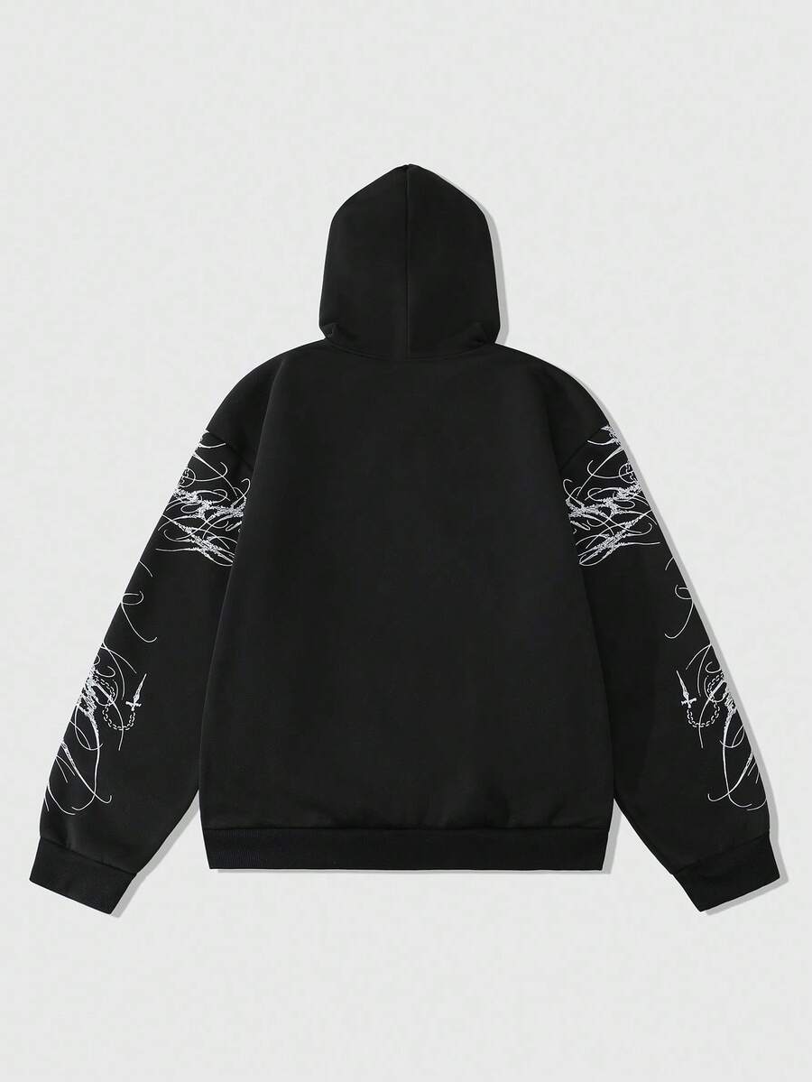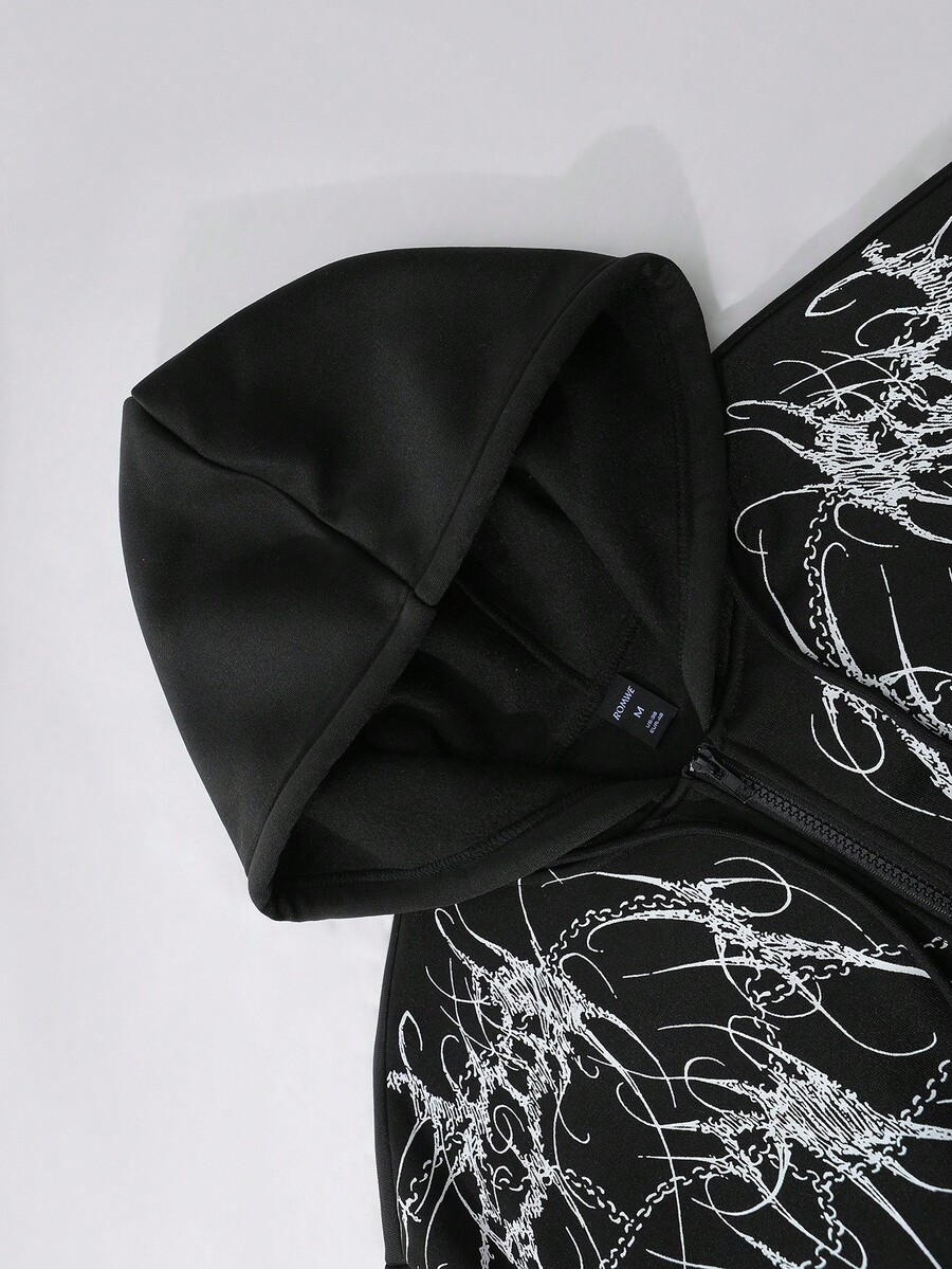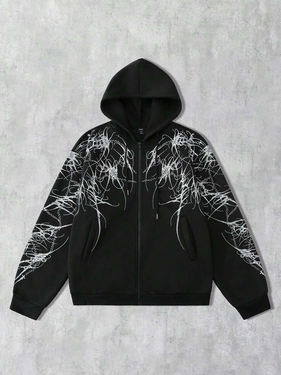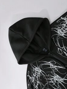Street Life Cardigan à capuche noir avec imprimé ligne gothique et chaîne, streetwear pour les jeunes hommes, tenue décontractée pour tous les jours, automne hiver