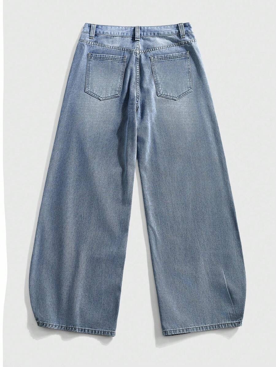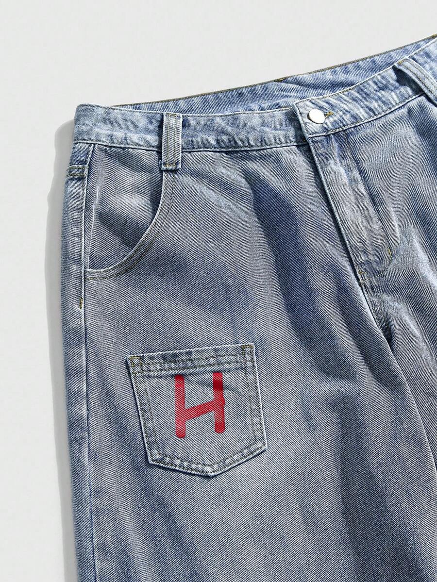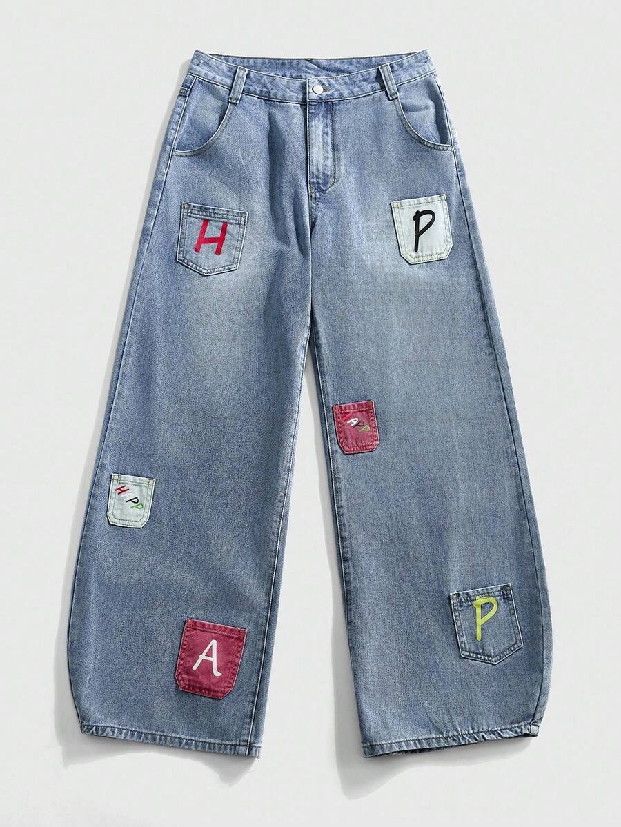 Street Life Jeans à jambes larges avec patch lettres, élément essentiel de la mode rétro