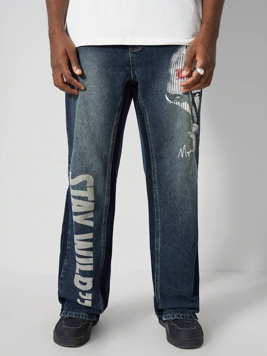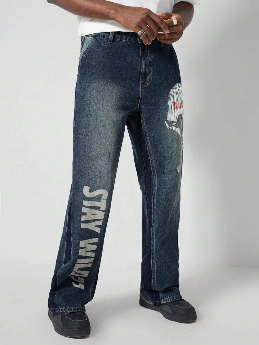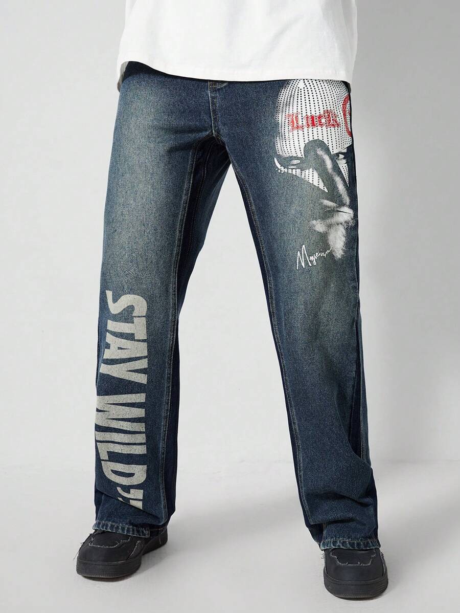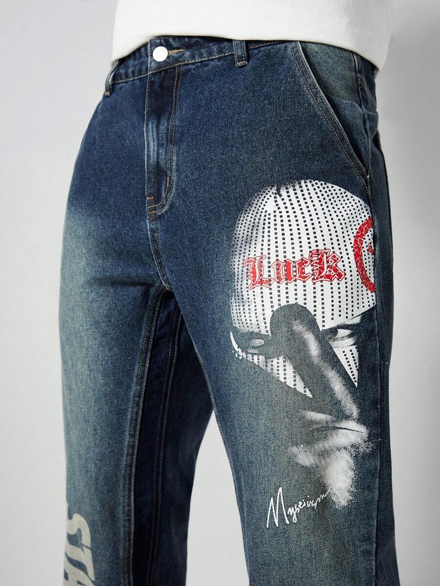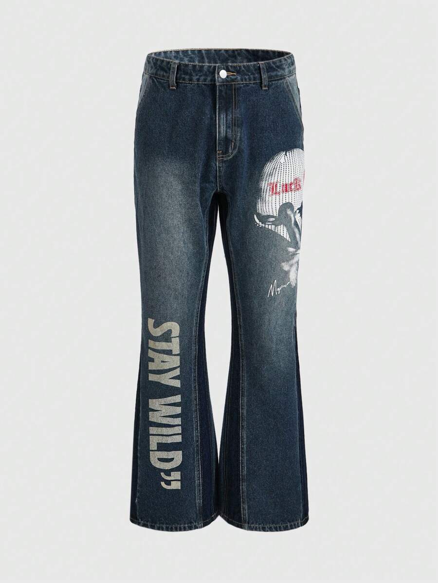Street Life Jeans évasés à la mode et polyvalents avec motif de lettres et de portraits lavés pour hommes