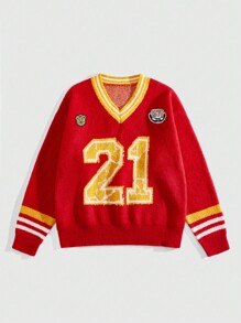 Street Life Pull oversize pour homme à col V avec rayures de style vareuse et graphique décoratif. Épaules tombantes.