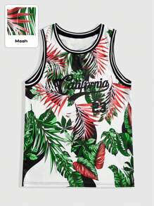 Street Life Maillot de basket-ball avec impression de plante tropicale et bloc de couleur, avec garniture contrastée pour l'été, les vacances à la plage, l'école