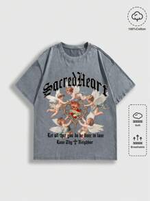 Street Life T-shirt à manches courtes rétro avec lavage acide, motif ange, pour homme. Convient pour un port quotidien au printemps/été