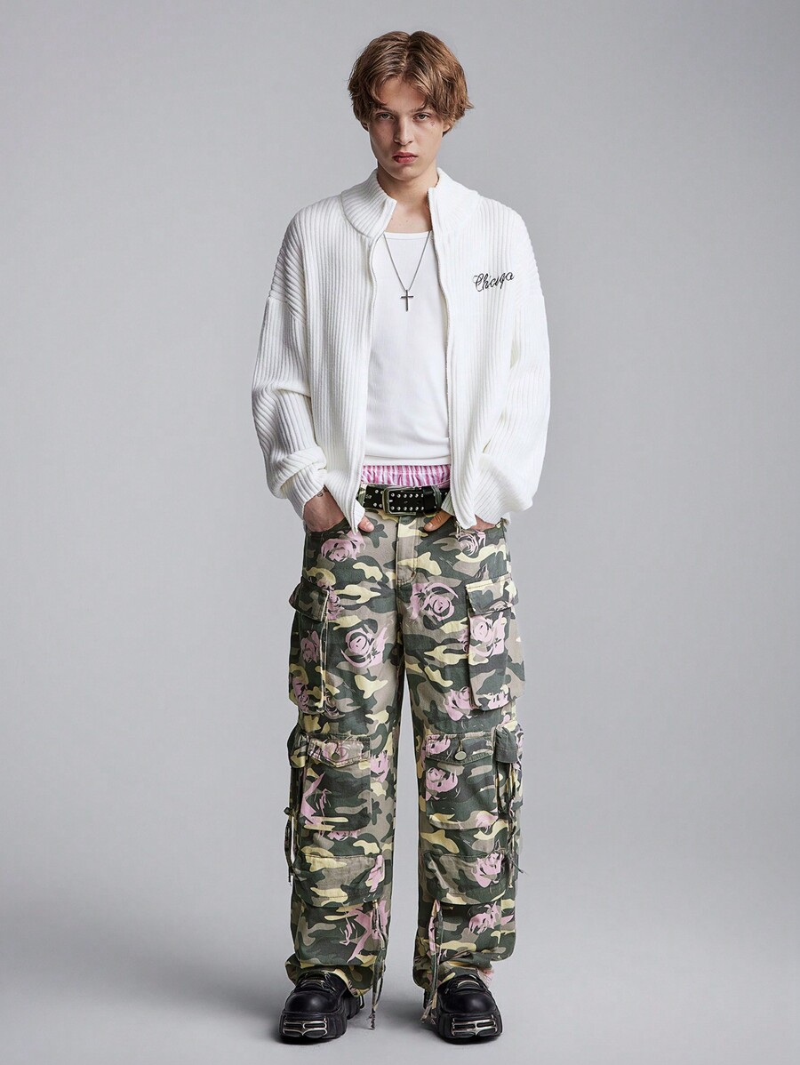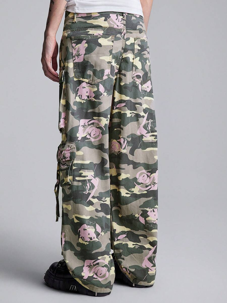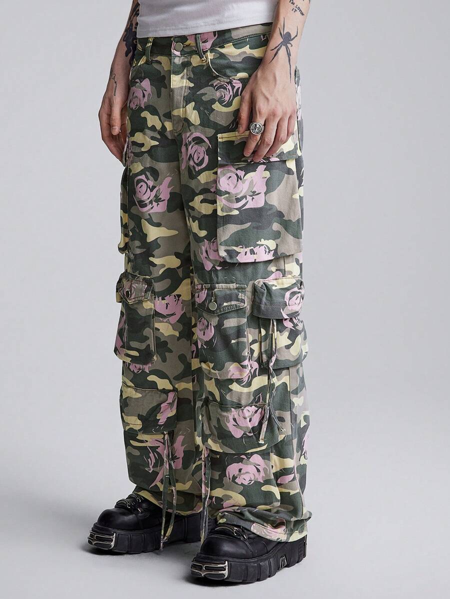 Street Life Jeans cargo droits décontractés à poches multiples avec imprimé camouflage et floral pour hommes