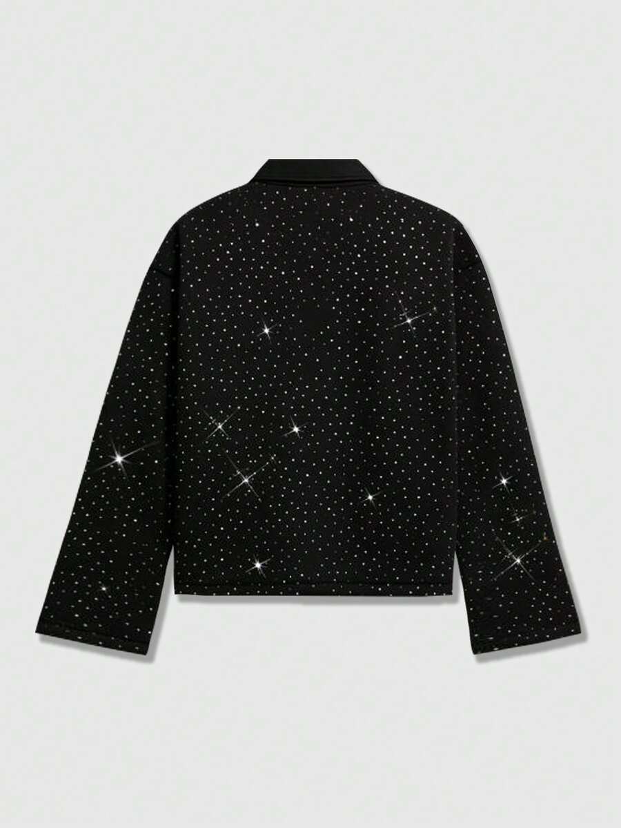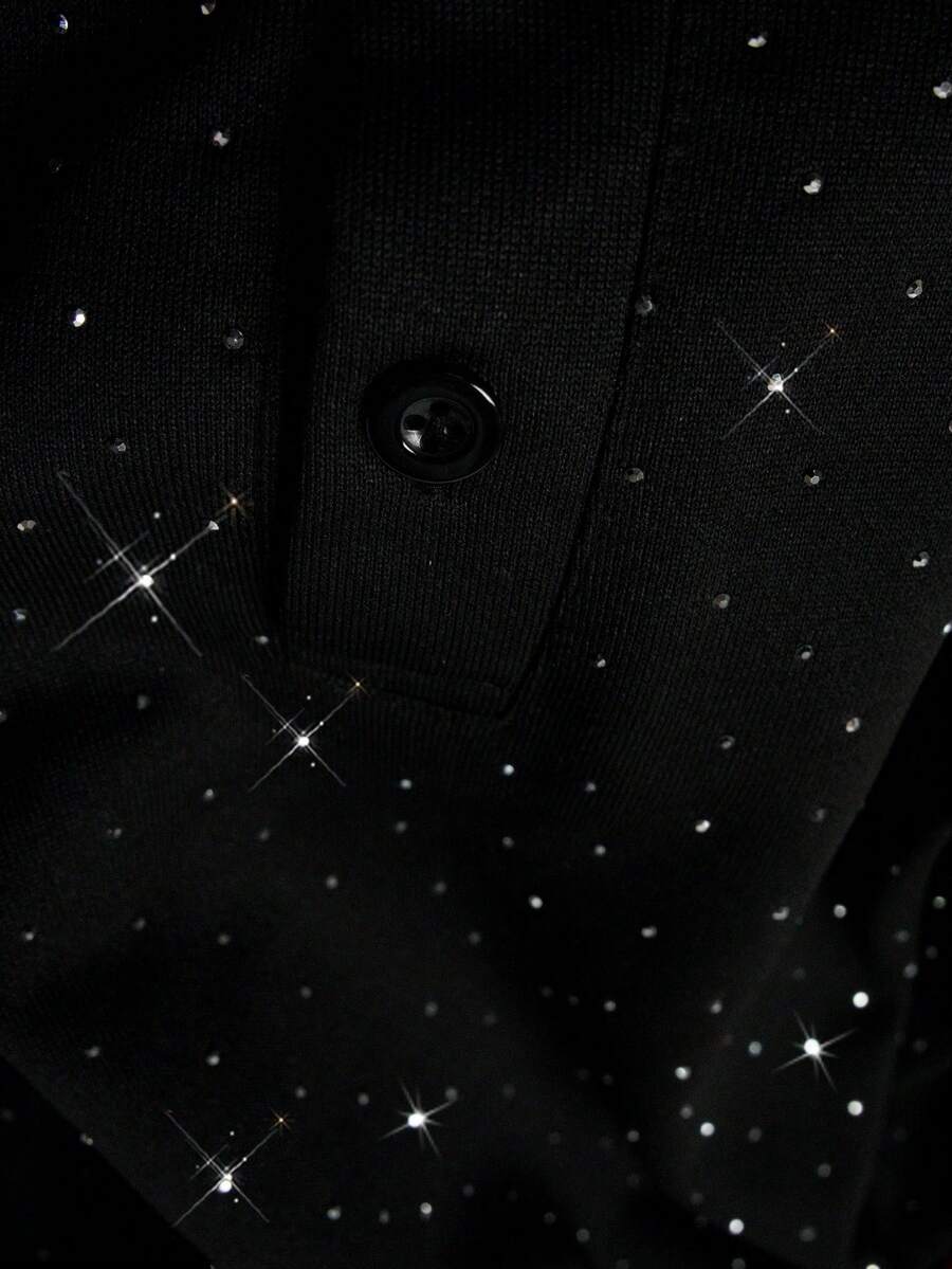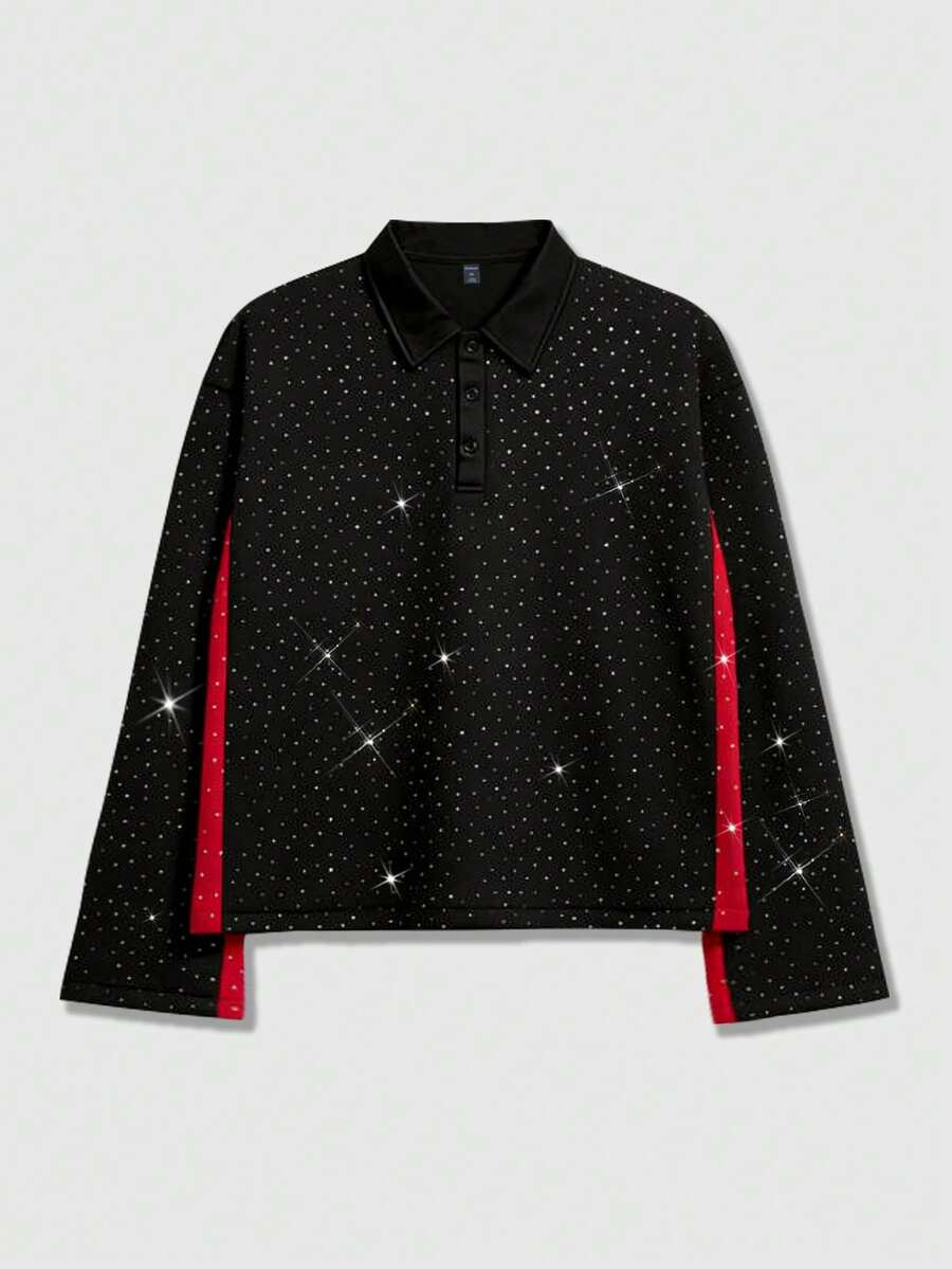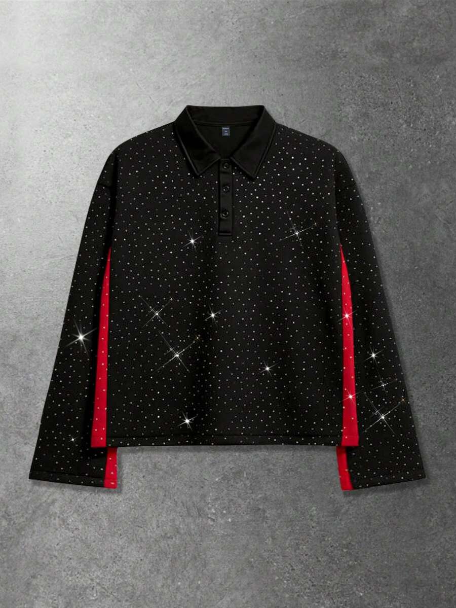 Street Life Polo à manches longues pour hommes, col contrasté avec ornements de strass, style décontracté