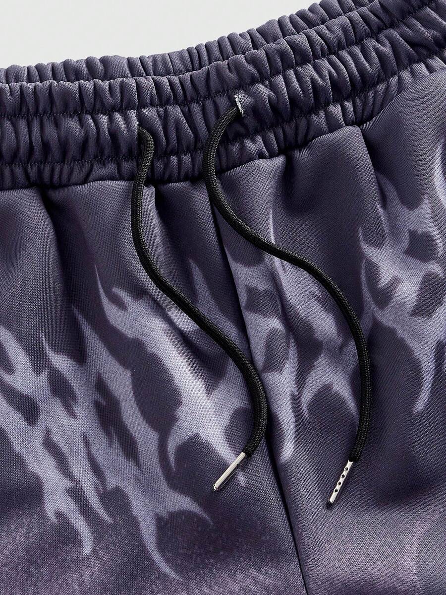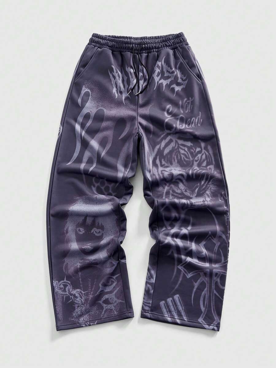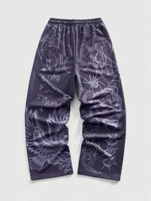 Street Life Pantalon de survêtement ample à jambes larges avec cordon de serrage à la taille, imprimé de lettres flamme de tigre, style mode de rue décontracté pour hommes