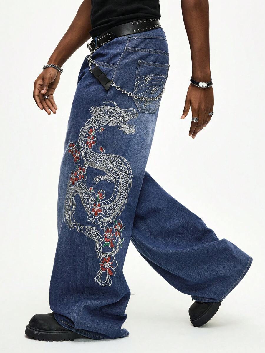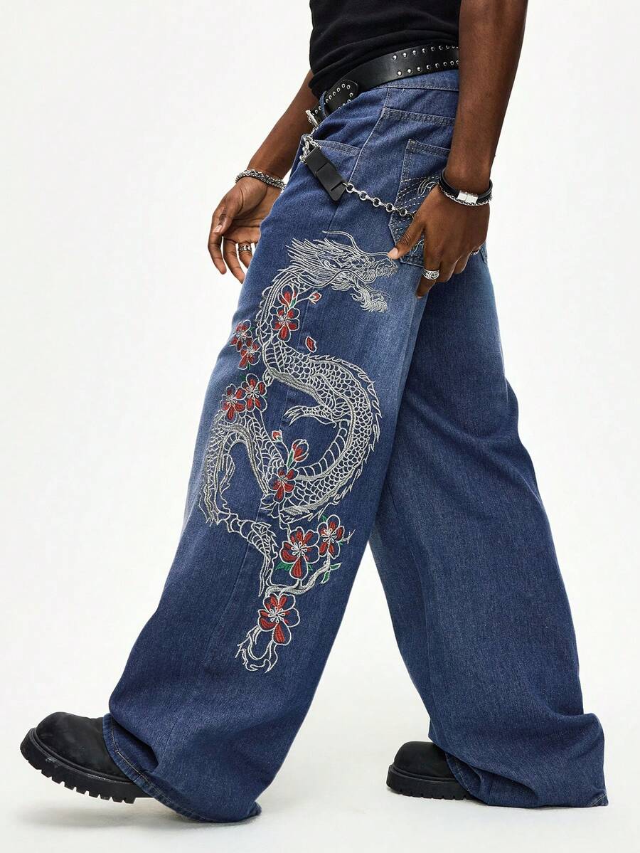 Street Life Jeans amples et décontractés à jambe large avec motif de dragon chinois pour hommes