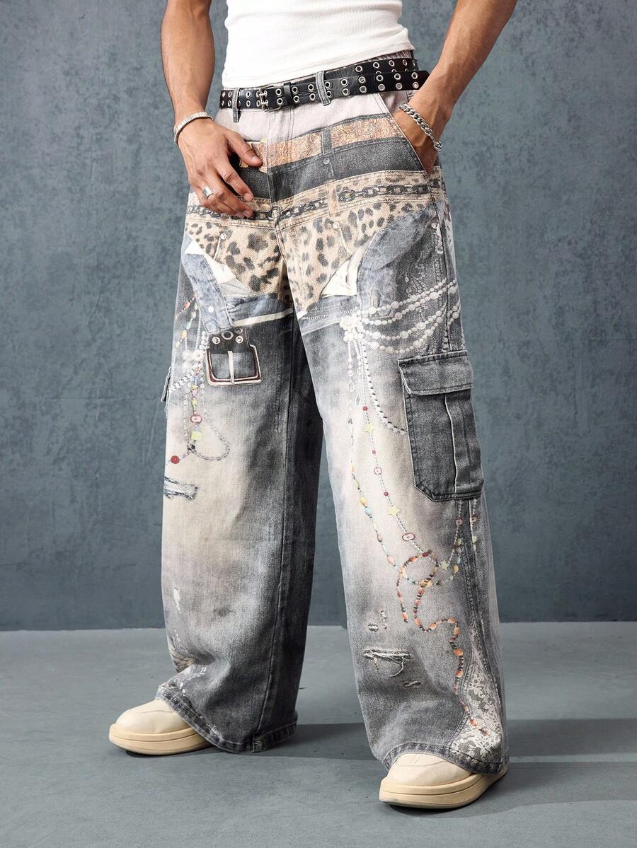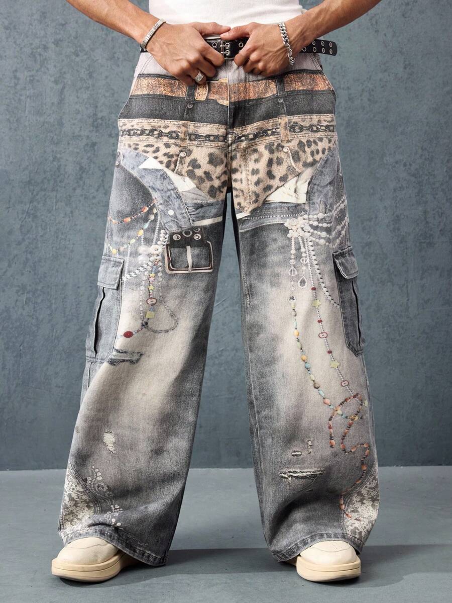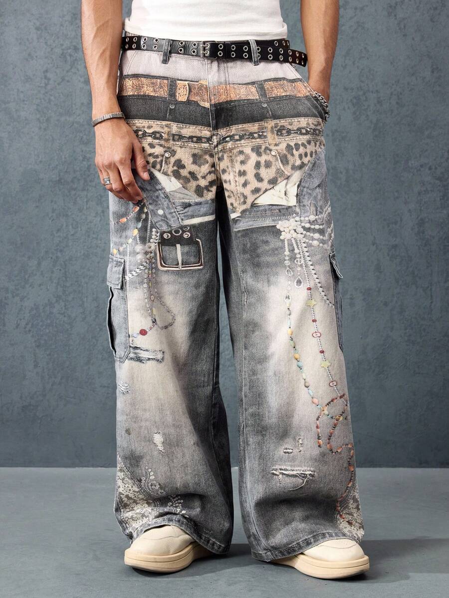 Street Life Jeans en denim pour hommes avec effet visuel imprimé, ceintures multiples