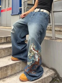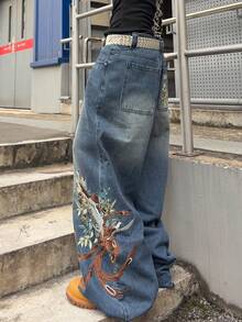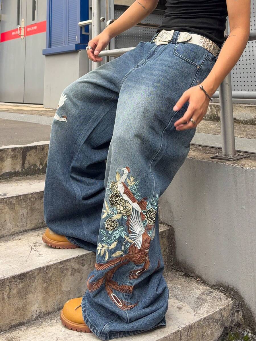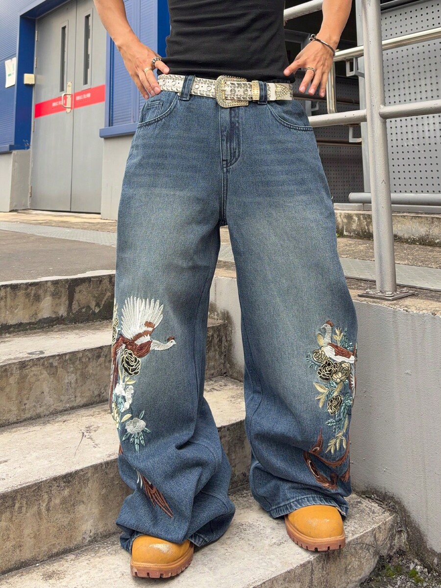 Street Life Jeans ample à jambe large avec motif de broderie florale pour hommes