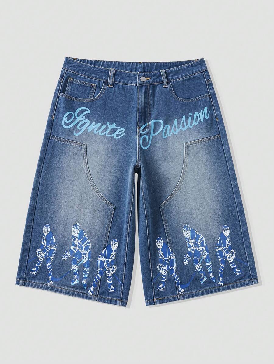 Street Life Short en denim de style décontracté et ample pour hommes avec imprimé de lettre et de chiffre, longueur sous le genou avec poche