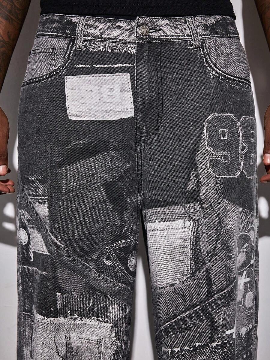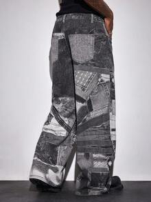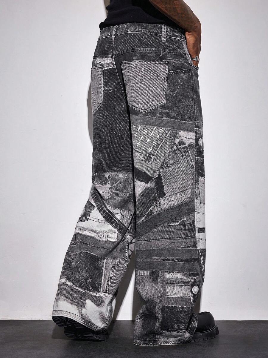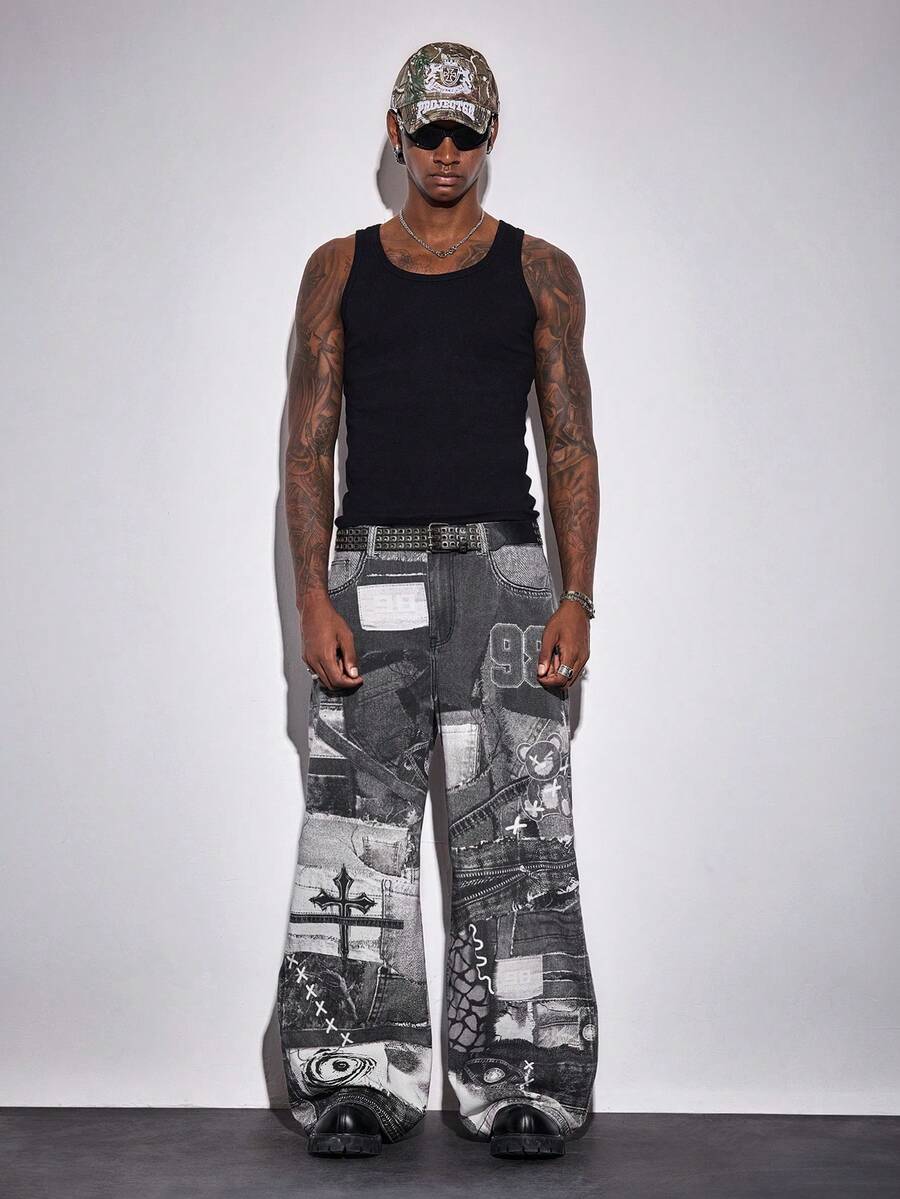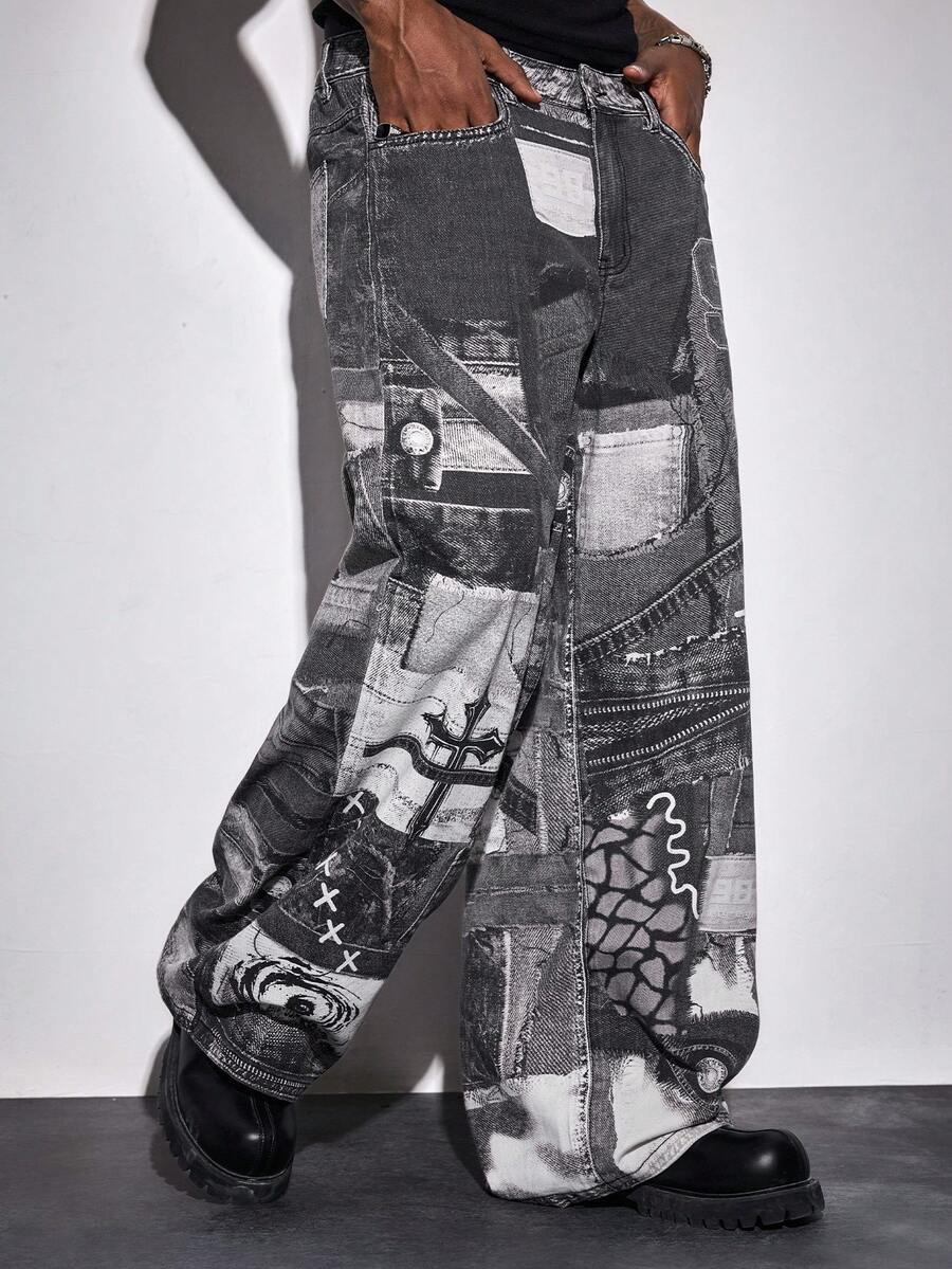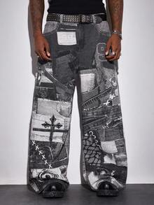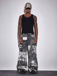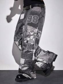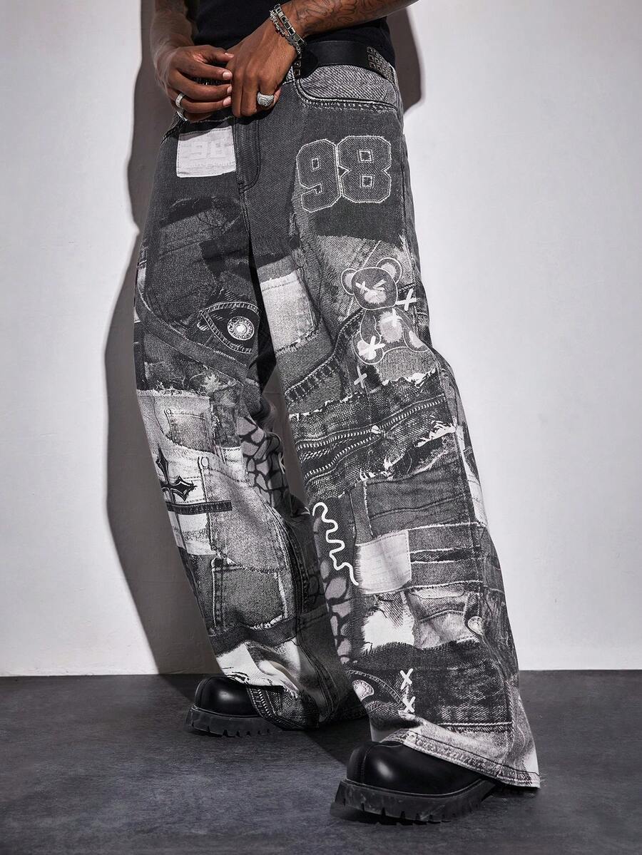 Street Life Jeans décontractés à jambe large avec poche et motif ours de dessin animé, coupe ample pour hommes