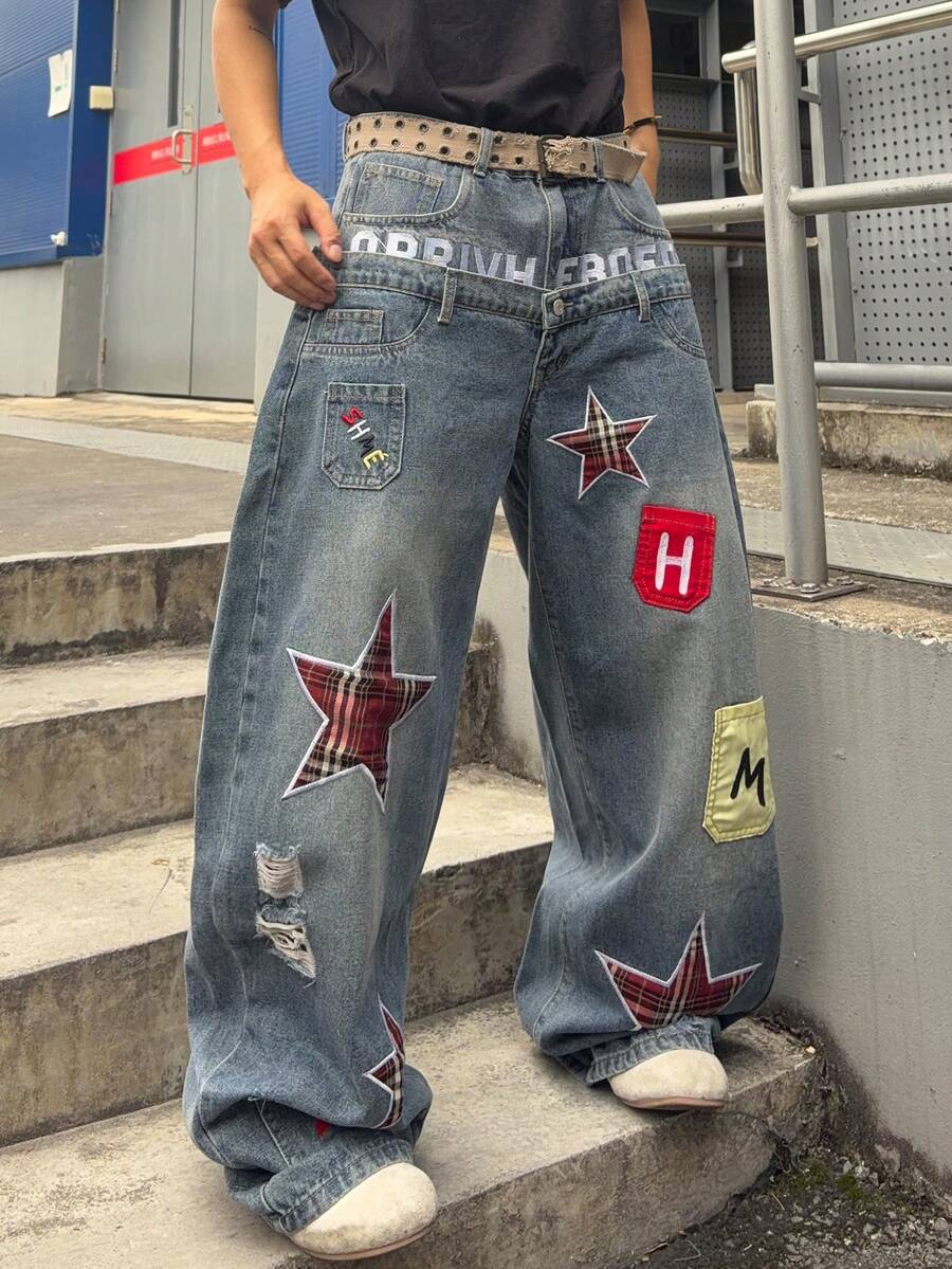 Street Life Jeans évasés à taille double avec broderie d'étoiles, coupe ample pour hommes