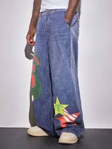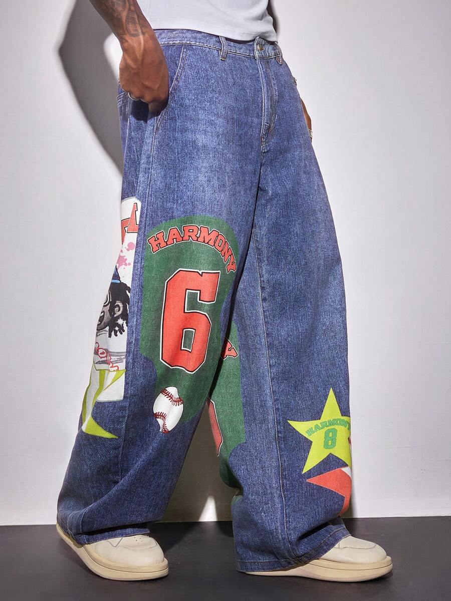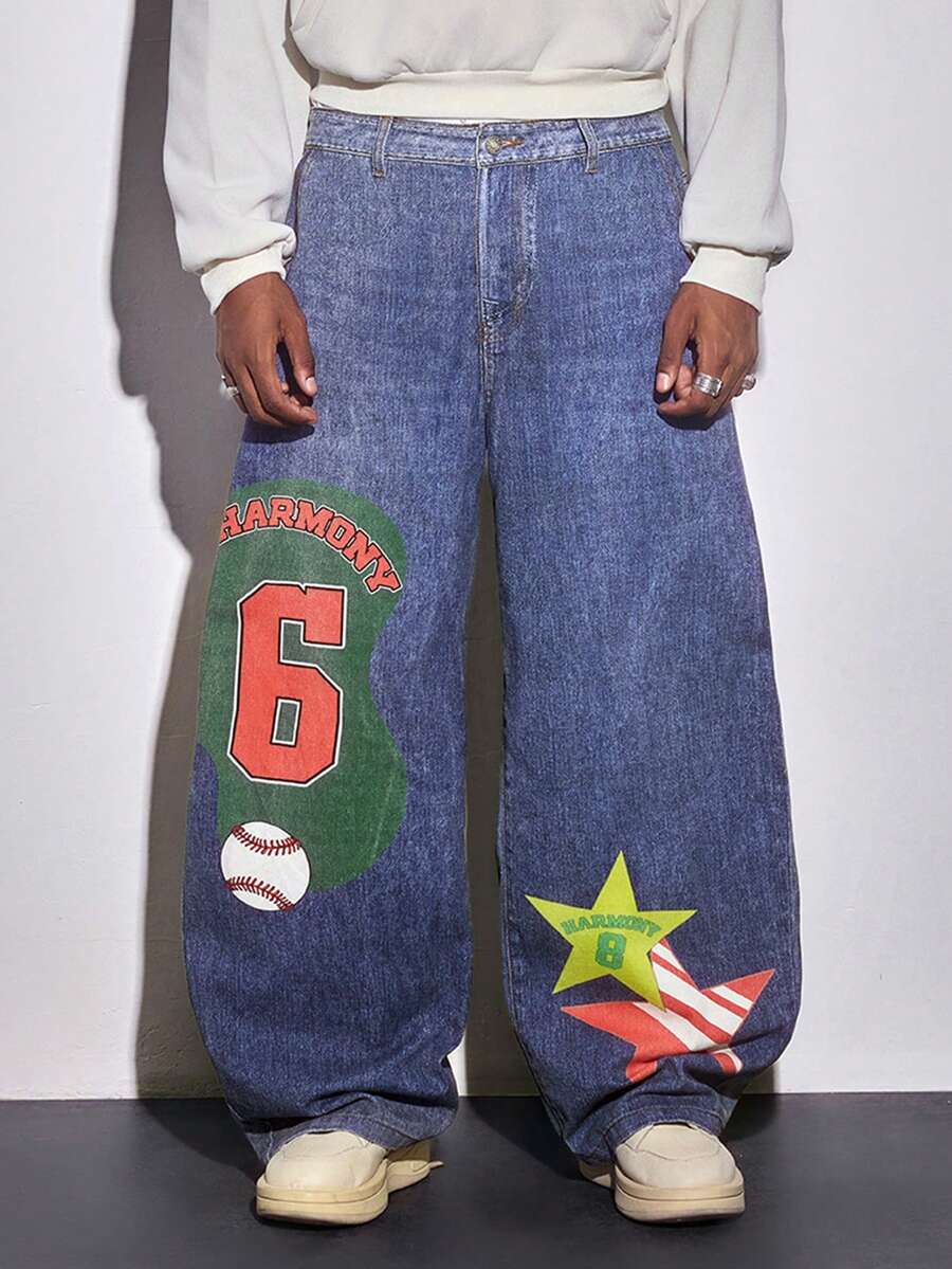 Street Life Jeans évasés à jambe large, ample et décontracté avec imprimé numérique sur la poche pour hommes