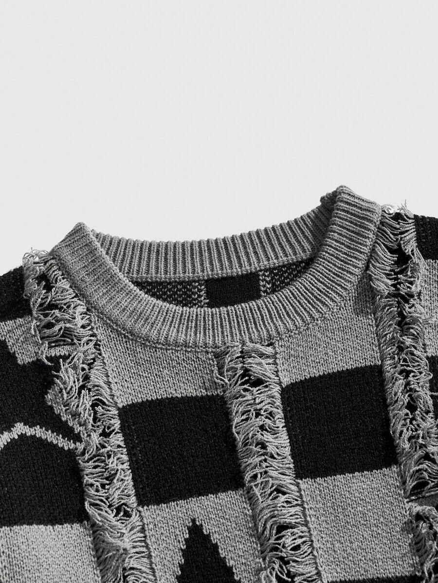 Street Life Pull ample à col rond à manches longues pour hommes avec motif jacquard, bords effilochés et aspect usé. Convient pour un port quotidien