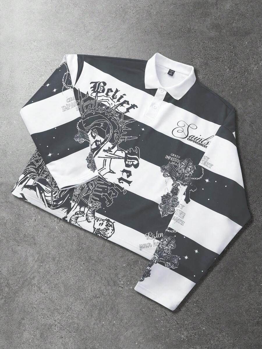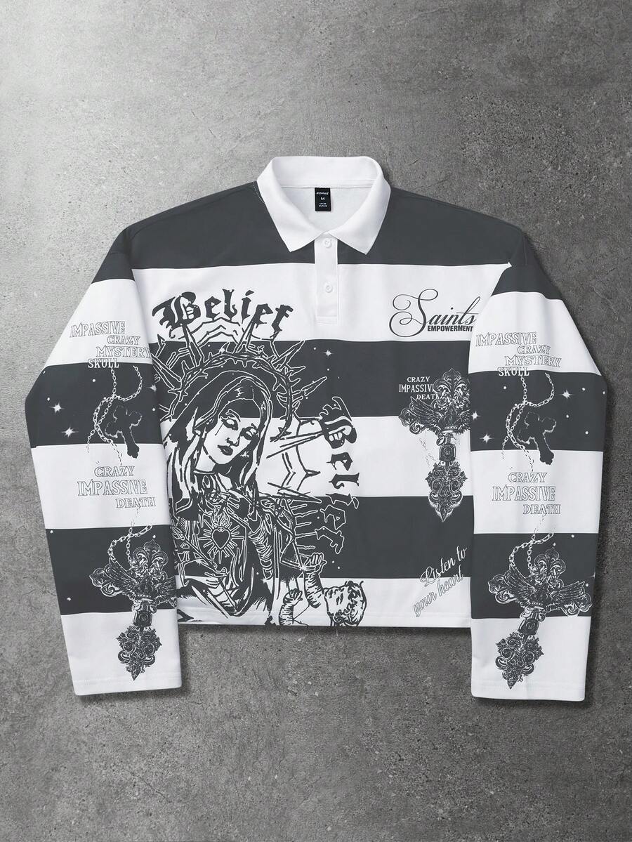 Street Life Sweat-shirt à imprimé graphique rétro de la Vierge Marie rayé, style de rue pour homme