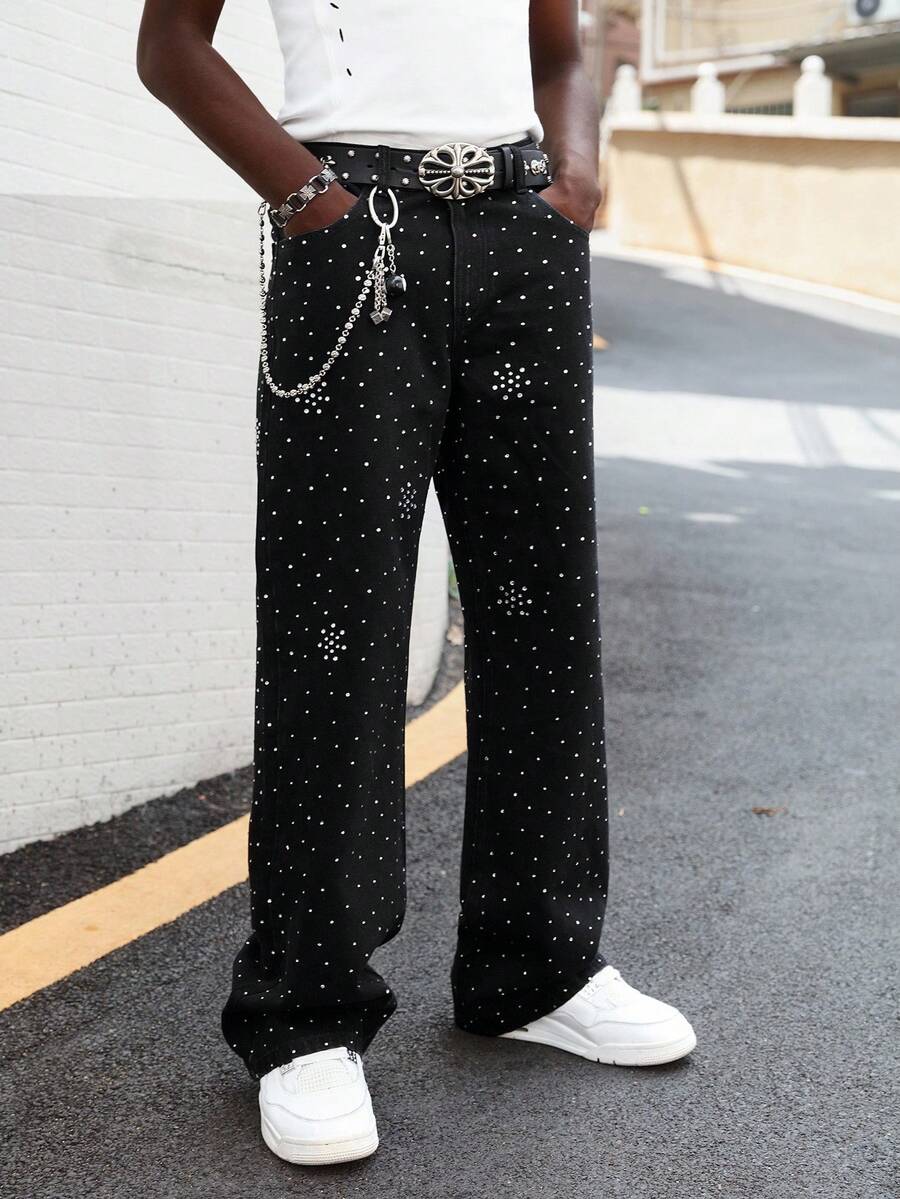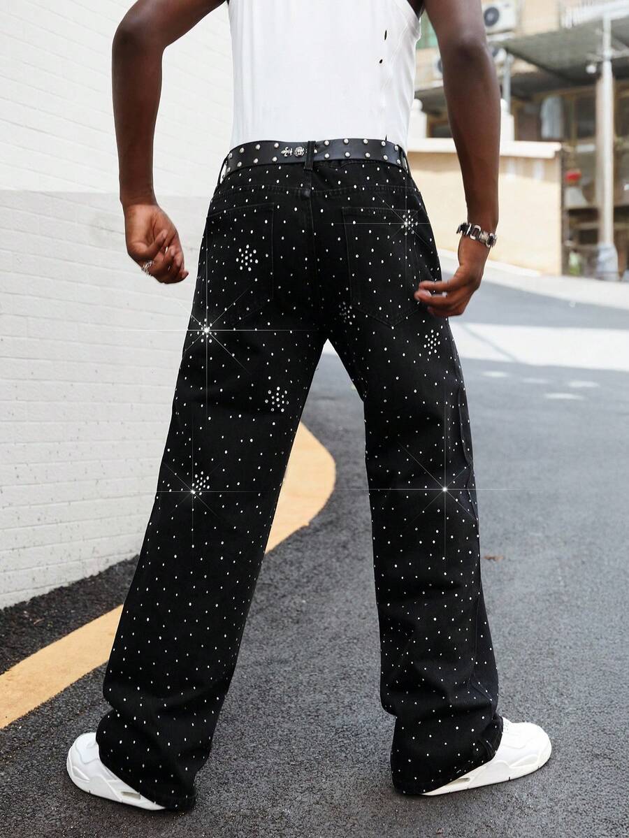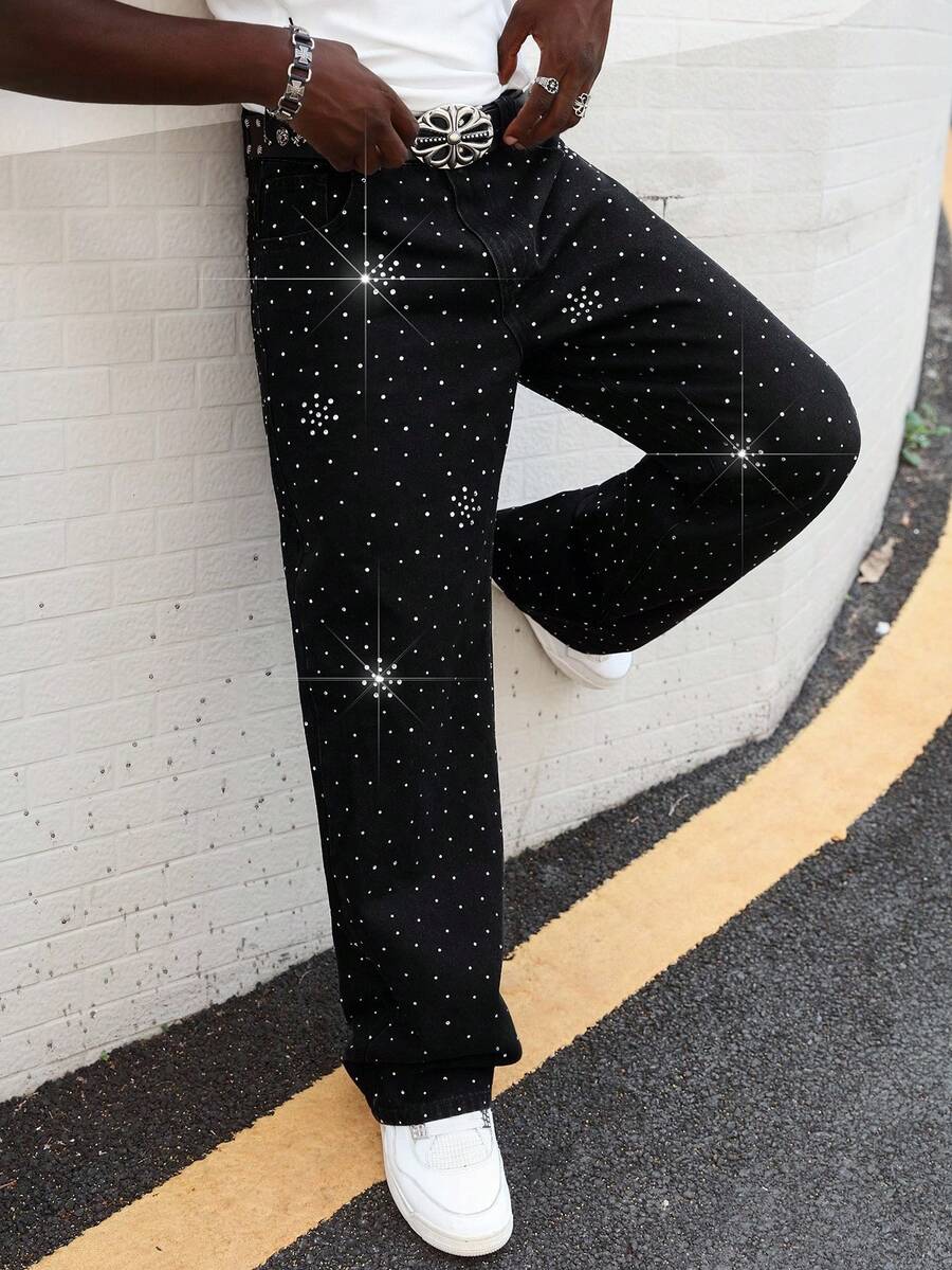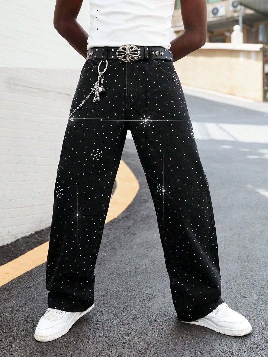 Street Life Jeans décontractés amples à jambes larges pour hommes avec poches ornées de strass, mode casual