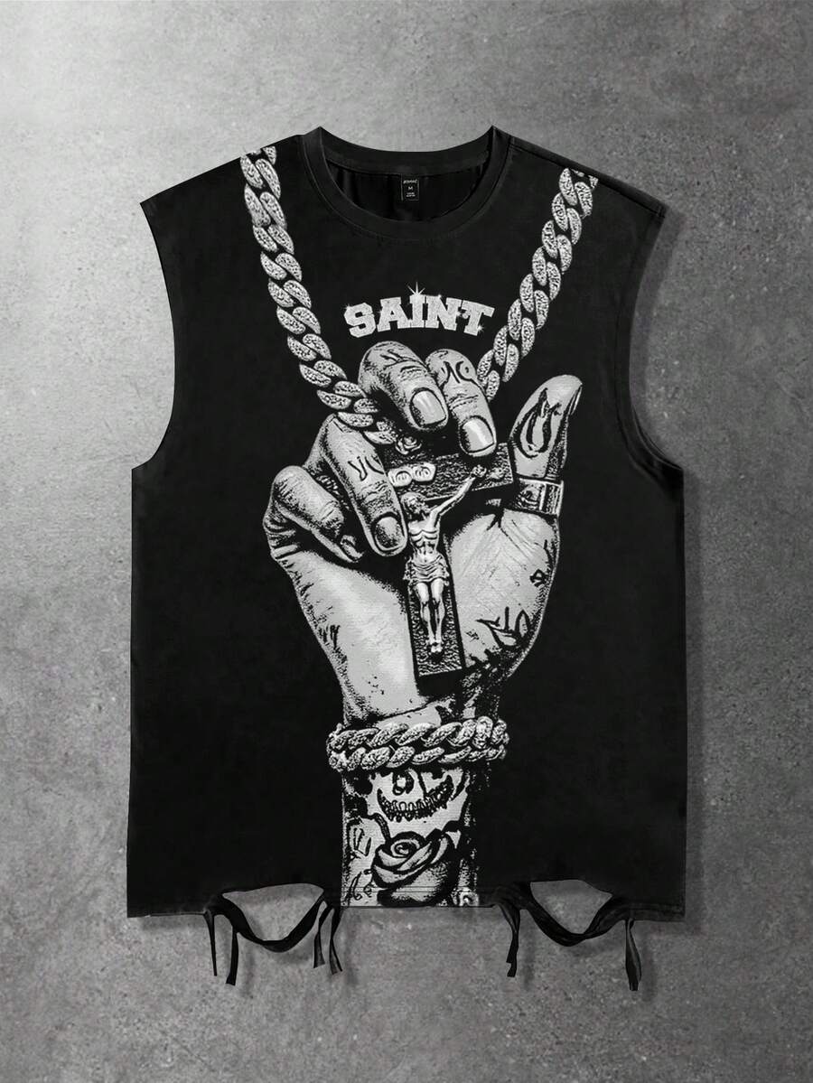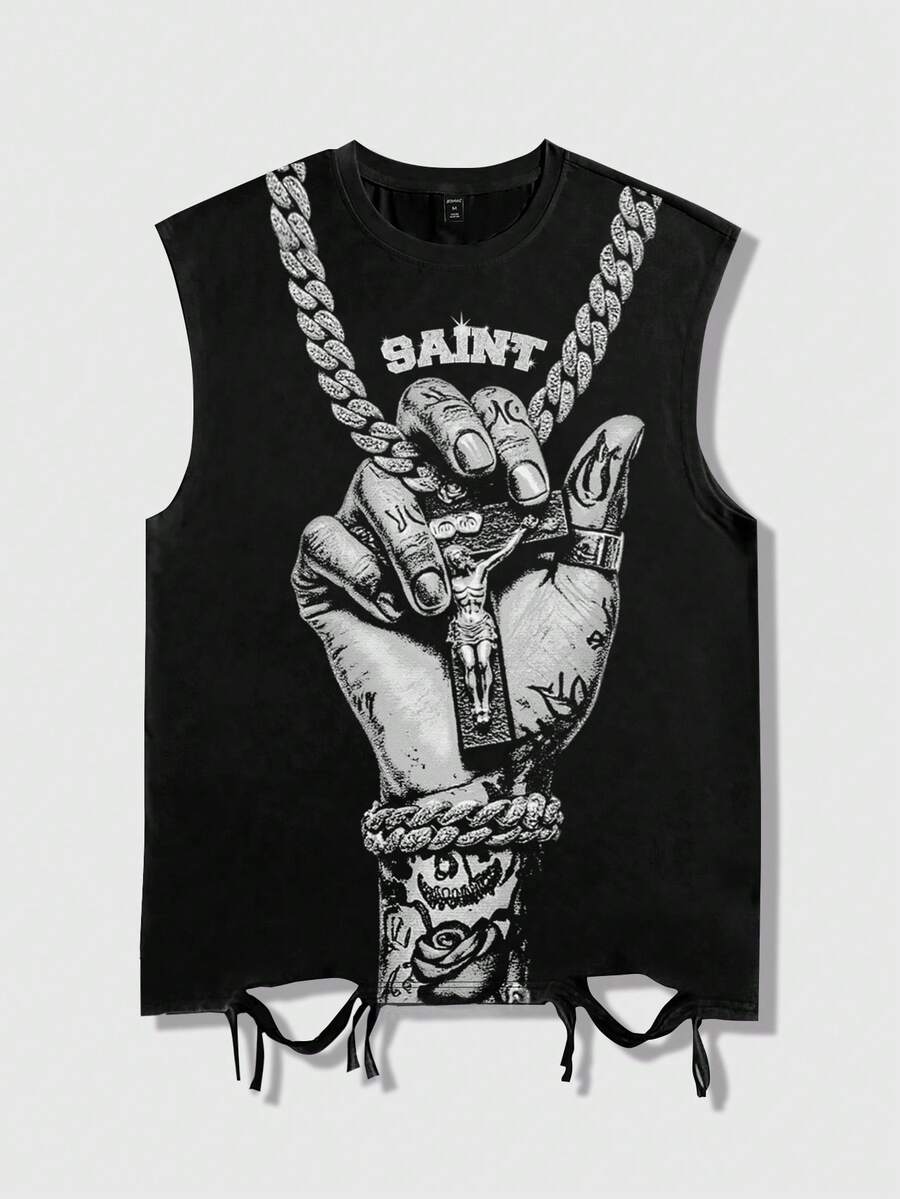 Street Life Débardeur décontracté polyvalent pour hommes avec col rond, imprimé lettres et palmiers