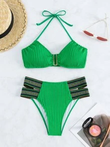 Ensemble bikini d'été à col ras-du-cou à rayures échelle avec découpes