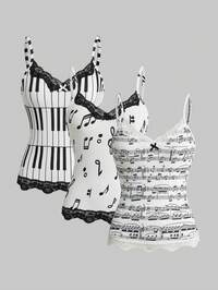 3 pièces Ensemble de camisole moulante avec dentelle et imprimé de notes de musique et de clavier de piano style Y2K vintage