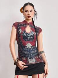 ROMWE Avant Top pour femmes avec style chinois, esthétique orientale et imprimé Bouddha