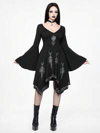 Robe femme gothique vintage à ourlet asymétrique, patchwork et manches évasées avec motif floqué