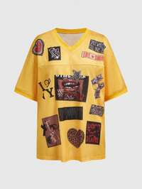 Grunge Punk T-shirt asymétrique pour femmes avec imprimé camouflage patchwork, lettres et motifs oculaires dans un style Y2K grunge rétro