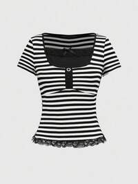 Fairycore T-shirt femme vintage Y2K 2 en 1 avec rayures et bordure en dentelle contrastée
