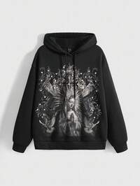 Goth sweat-shirt à capuche noir avec poche, graphique de rue mystérieux et sombre de la Vierge Marie gothique avec des vignes