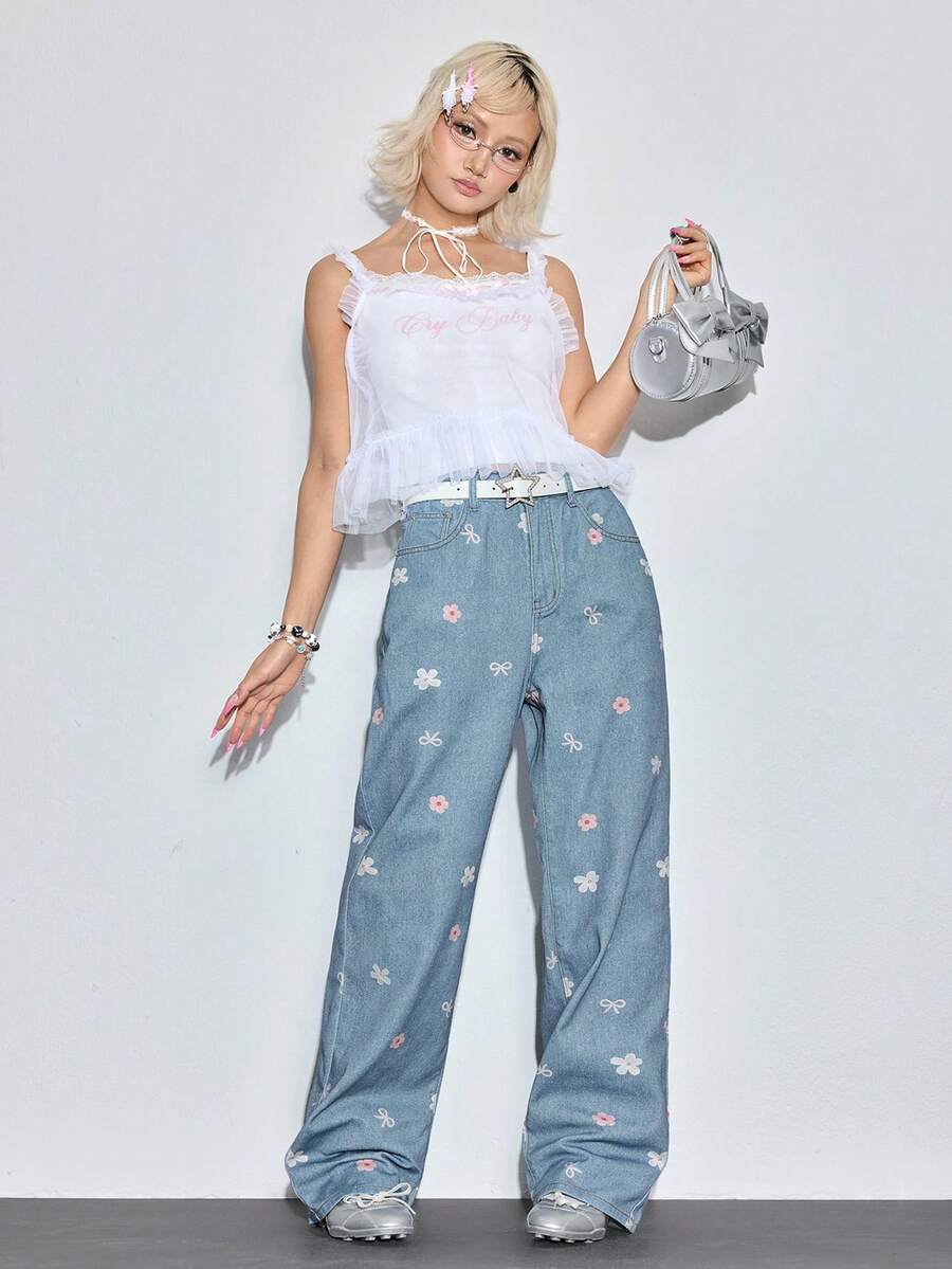Sweetness Jeans bleus imprimés fleurs doux et décontractés pour femmes