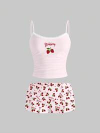 Kawaii 2 pièces/Ensemble Débardeur et short d'été pour femme avec imprimé lettre et cœur à bretelles fines