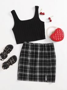 Fille adolescente Ensemble jupe à carreaux à ourlet fendu et top en tricot côtelé