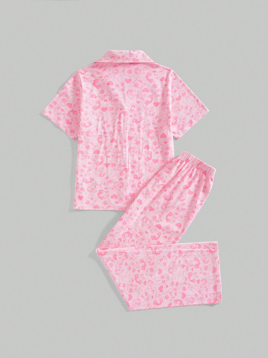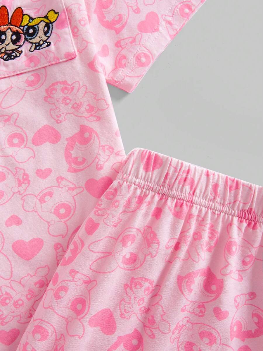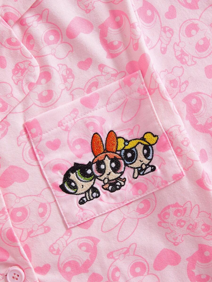 The Powerpuff Girls | ROMWE Ensemble de pyjama confortable avec chemise à col et manches courtes brodée avec dessin animé et pantalon long, 100% coton