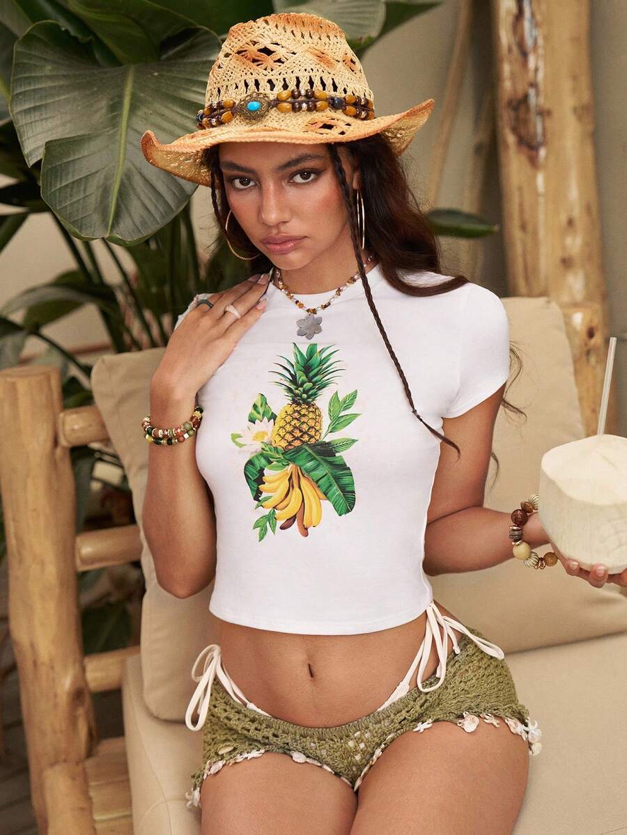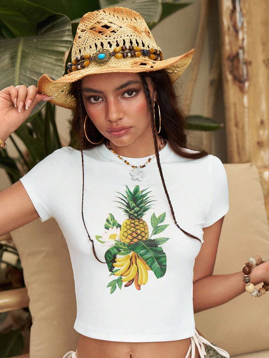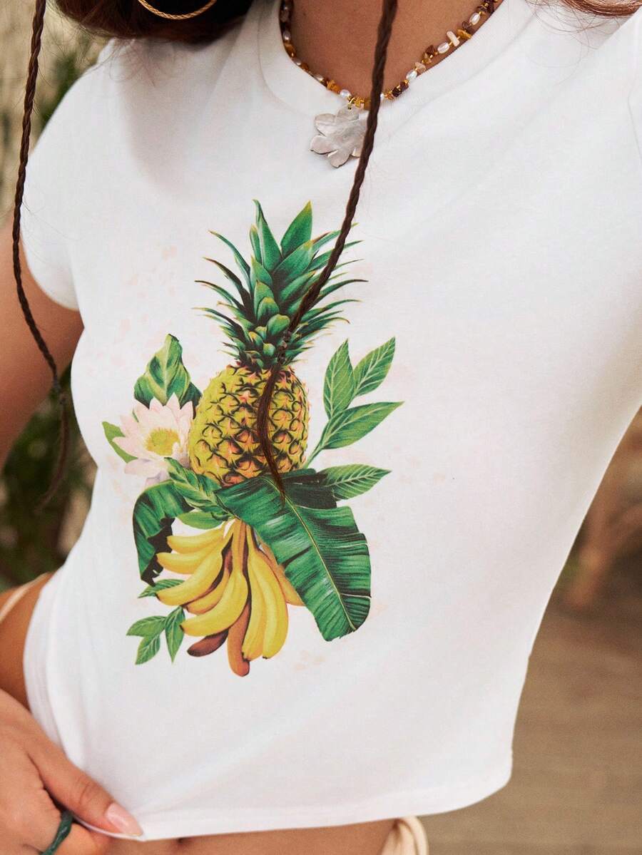 The White Lotus T-shirt blanc à manches courtes, imprimé ananas et banane, style décontracté pour femme