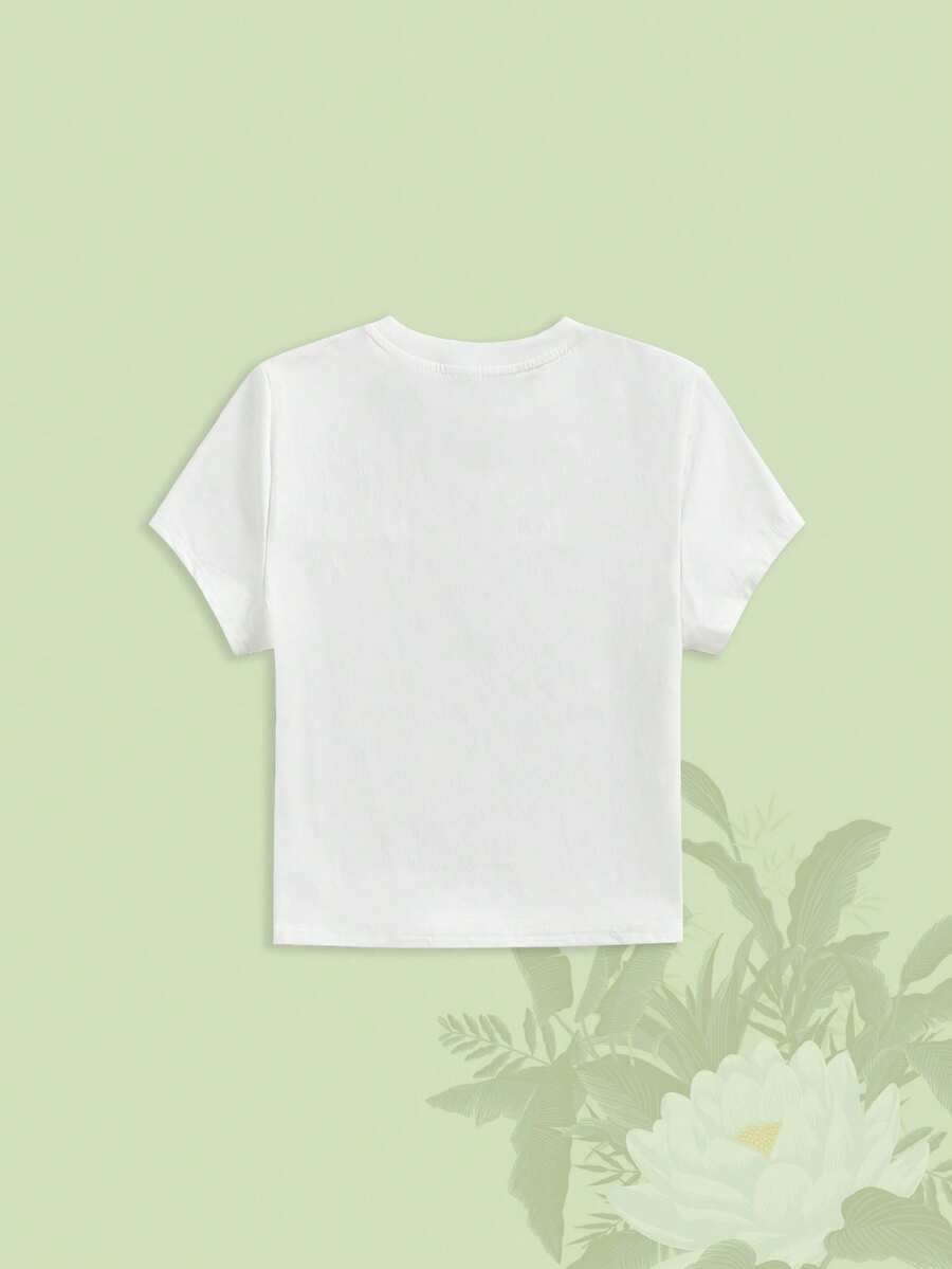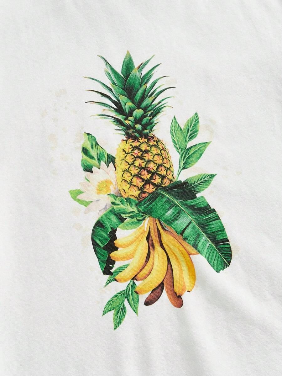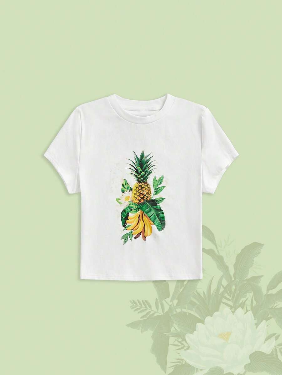 The White Lotus T-shirt blanc à manches courtes, imprimé ananas et banane, style décontracté pour femme