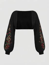 Fairycore Cardigan court en tricot noir, veste châle à manches bouffantes avec broderie de champignons et d'étoiles, Top slim ajusté au design de niche rétro