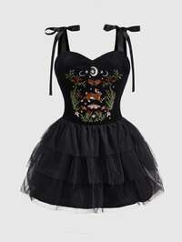 Robe évasée en maille multicouche avec broderie de motifs gothiques de lapin, plante, papillon, jungle d'épines, étoile et lune. Robe brodée de style palais vintage à coupe courte, grande taille