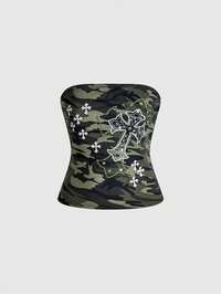 Grunge Punk Débardeur court vintage camouflage avec broderie croix et clous