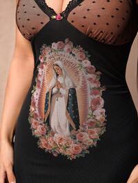 PETITE Robe longue pour femmes avec imprimé Vierge Marie et superposition de maille