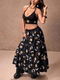 Ensemble 2 pièces jupe taille basse et Top décolleté sexy style Y2K, imprimé cachemire bohème hippie pour festival de musique