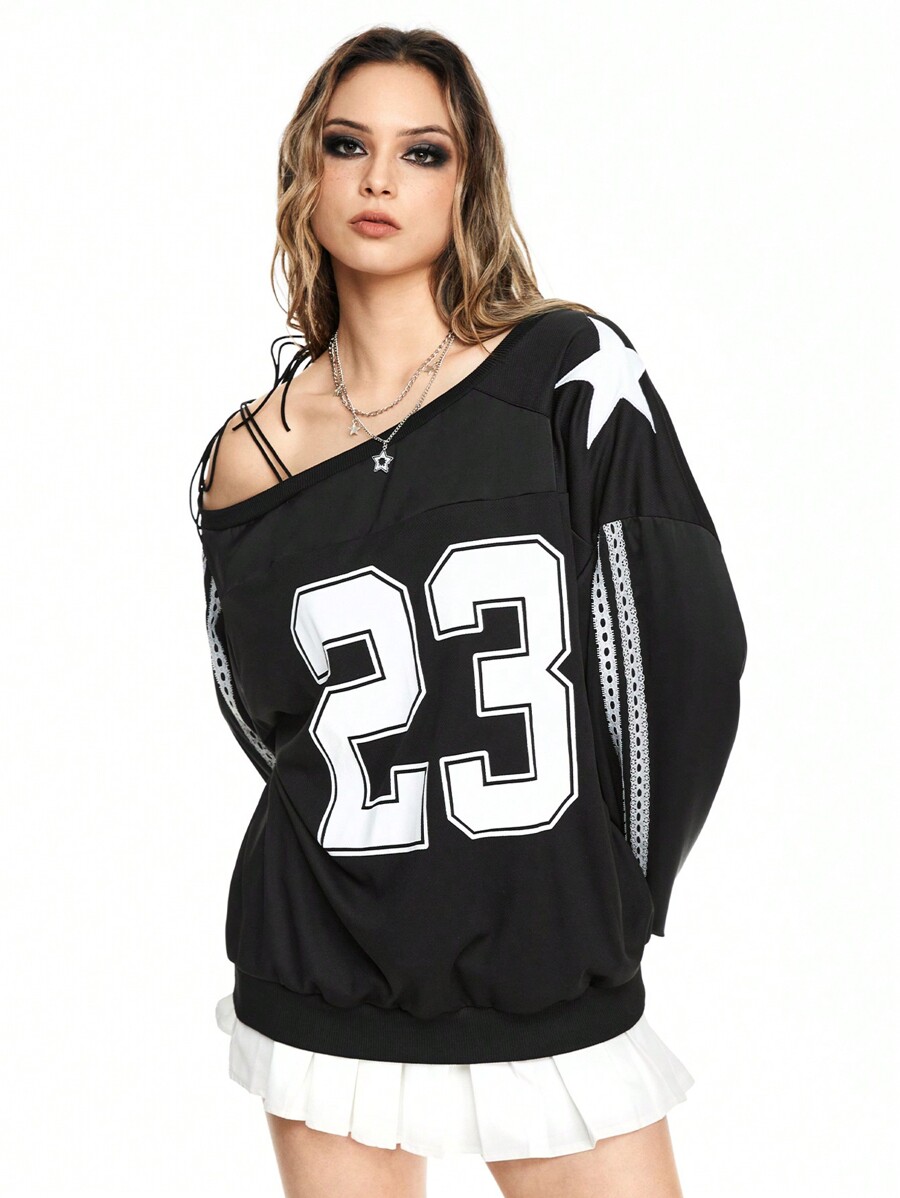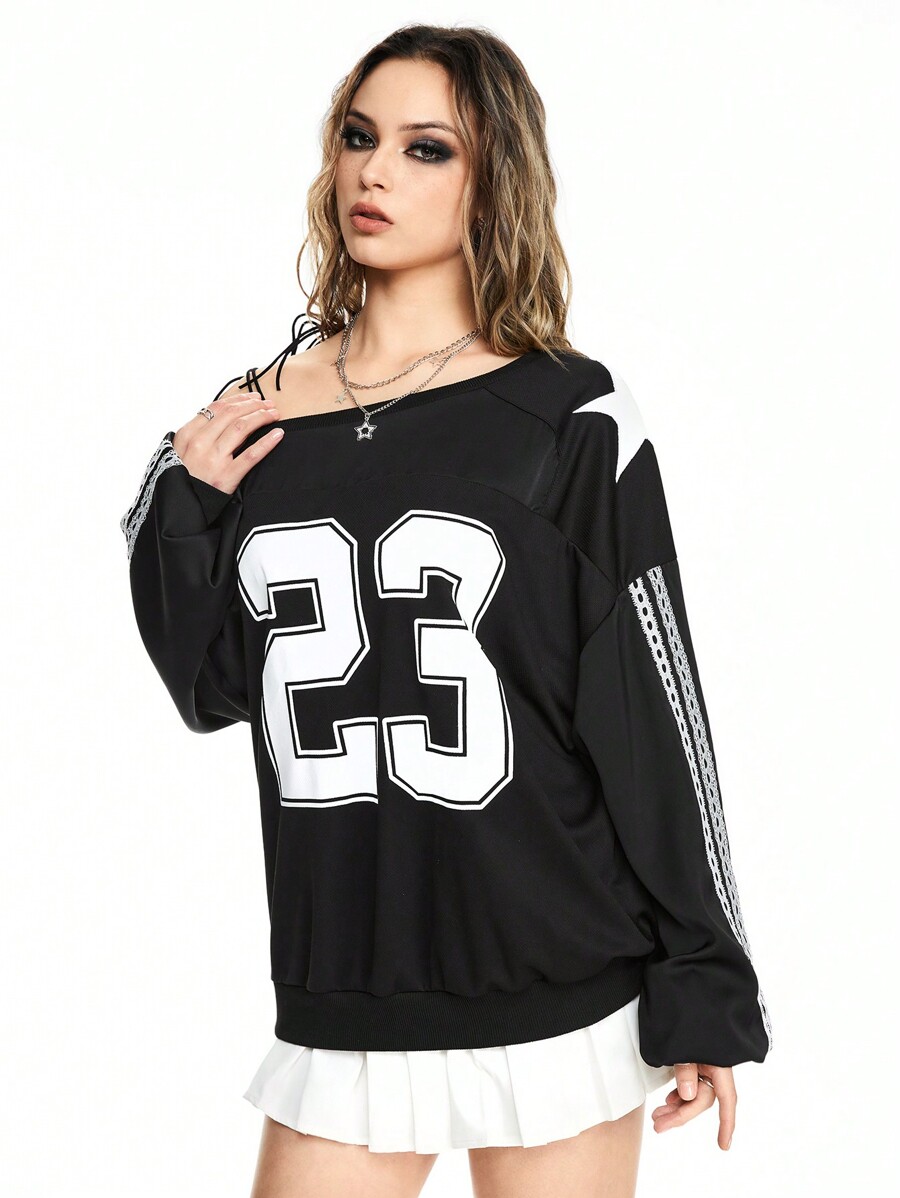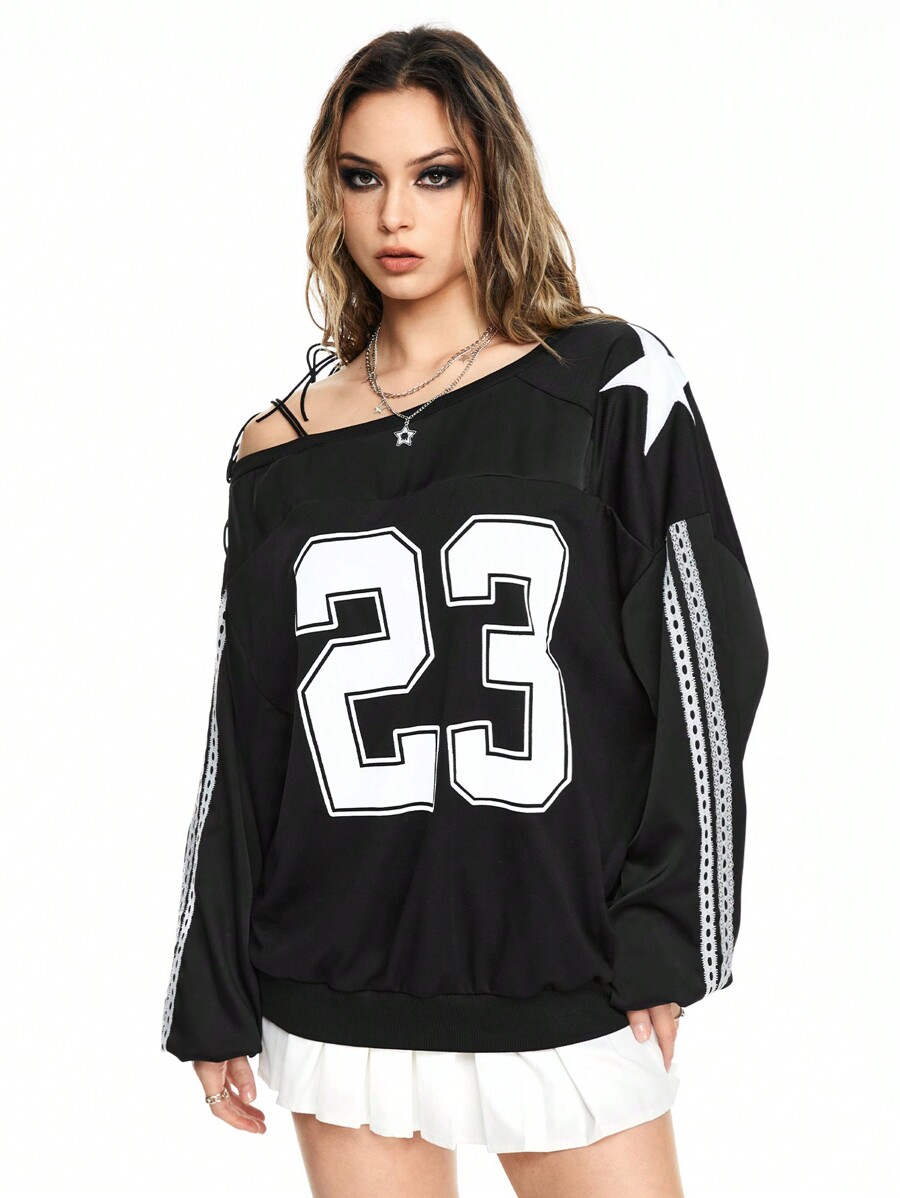 Sweat-shirt satin ample avec encolure asymétrique et imprimé graphique de numéro de football, style de rue pour femmes