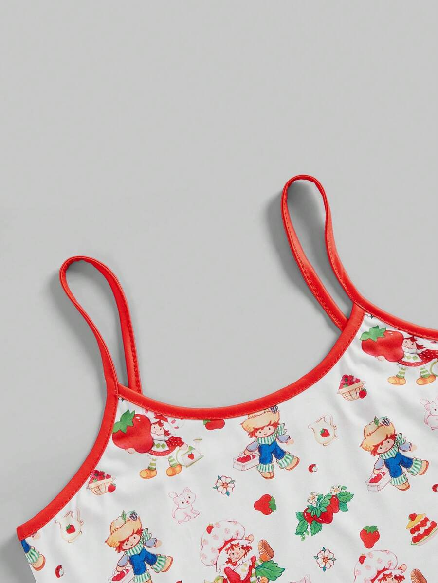 Ensemble pyjama femme constitué d'un debardeur ringer à volant avec imprimé figure de dessin animé et fraise, et d'un short, dans un style décontracté et mignon