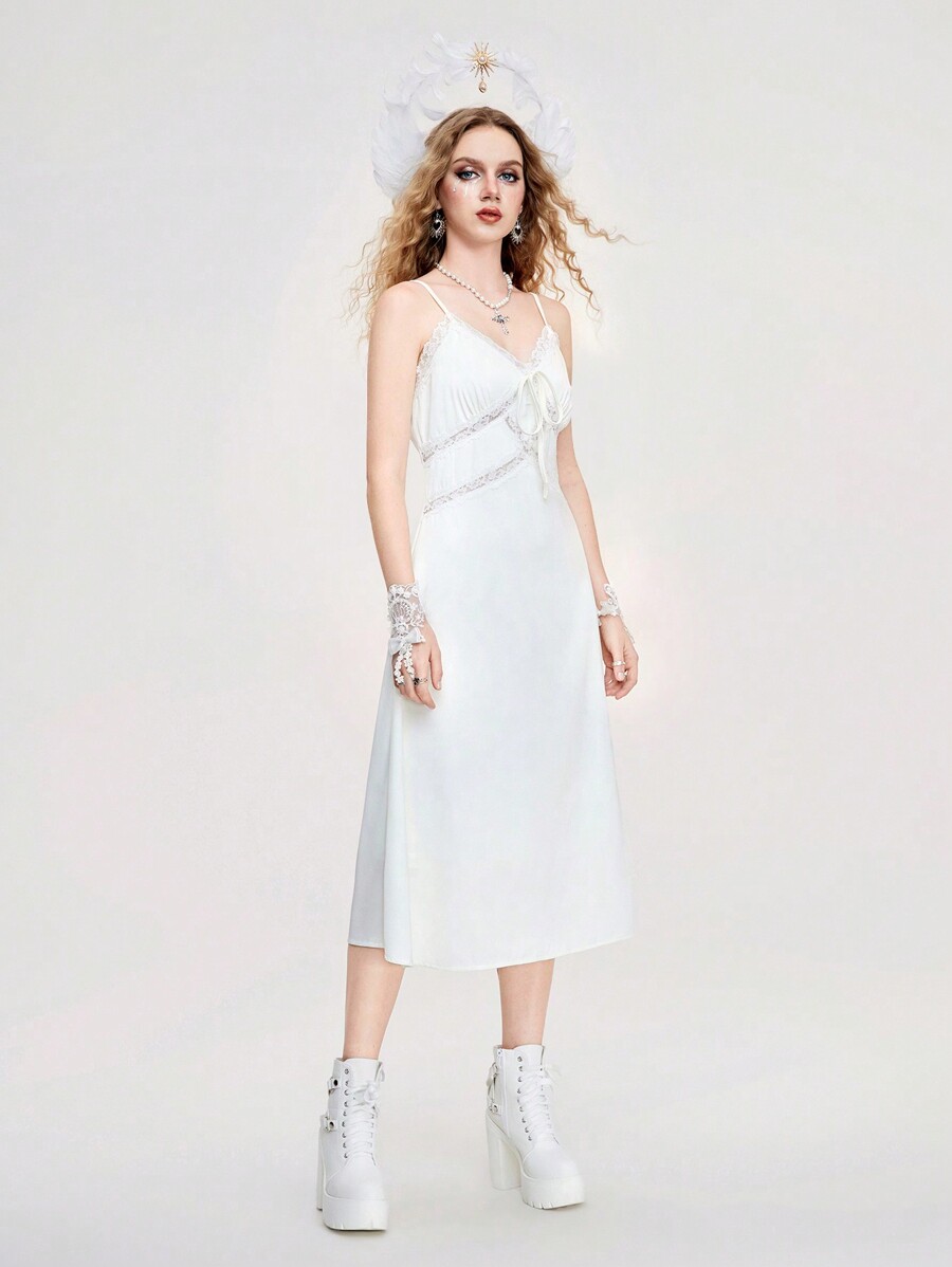 Robe fendue en satin monochrome avec bordure en dentelle pour femme