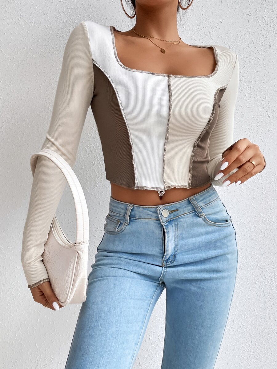 Haut court pour femme à encolure carrée à coutures contrastées à manches longues en tricot côtelé à blocs de couleurs