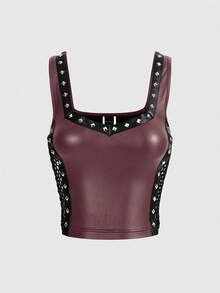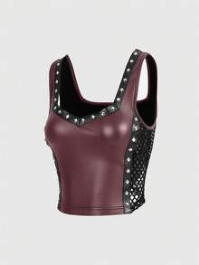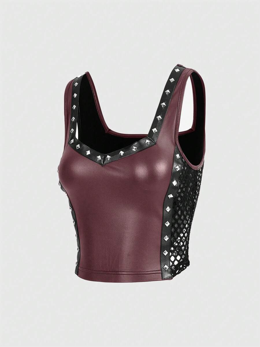 Top femme mode punk de rue en cuir PU avec décoration de rivets, filet latéral et effet ajouré