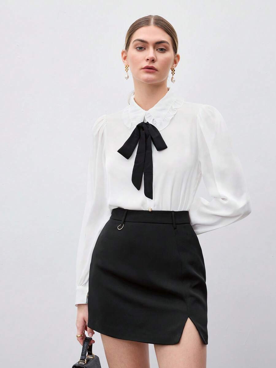Blouse décontractée à manches longues, col claudine et manches à volants pour femmes. Élégante pour le travail et les déplacements, pour l'automne